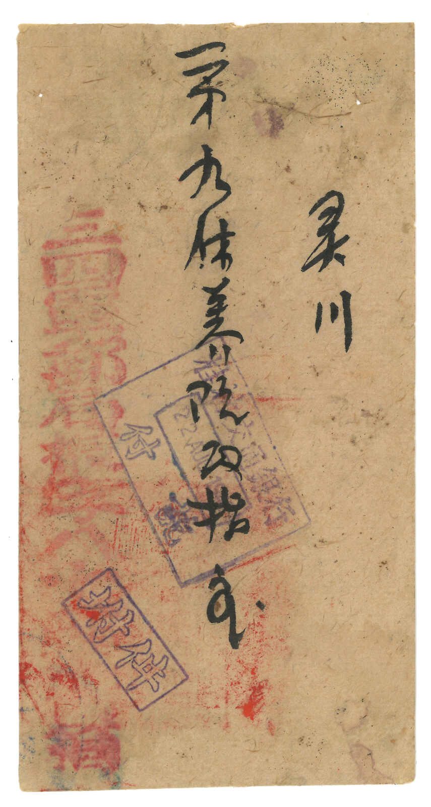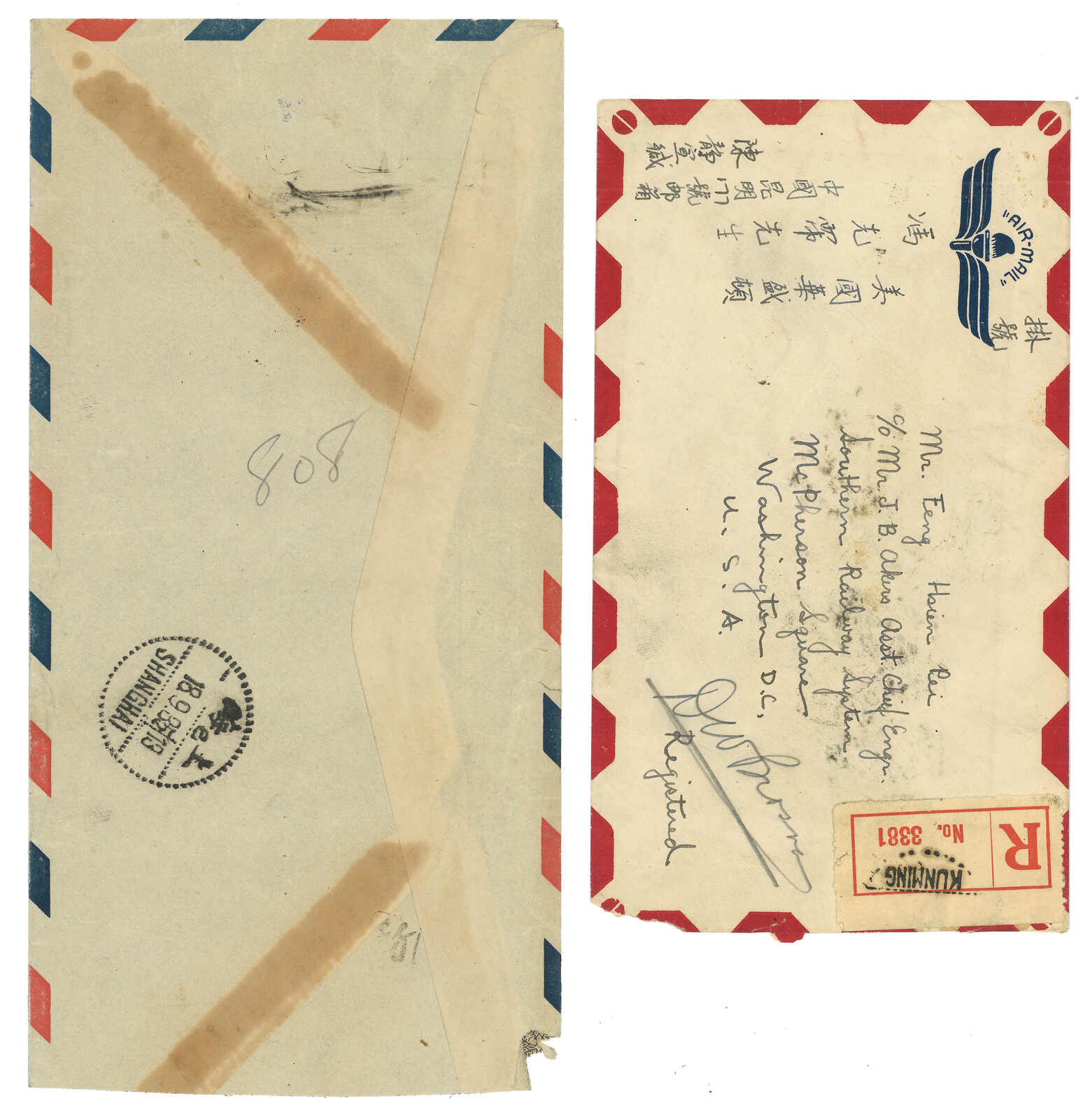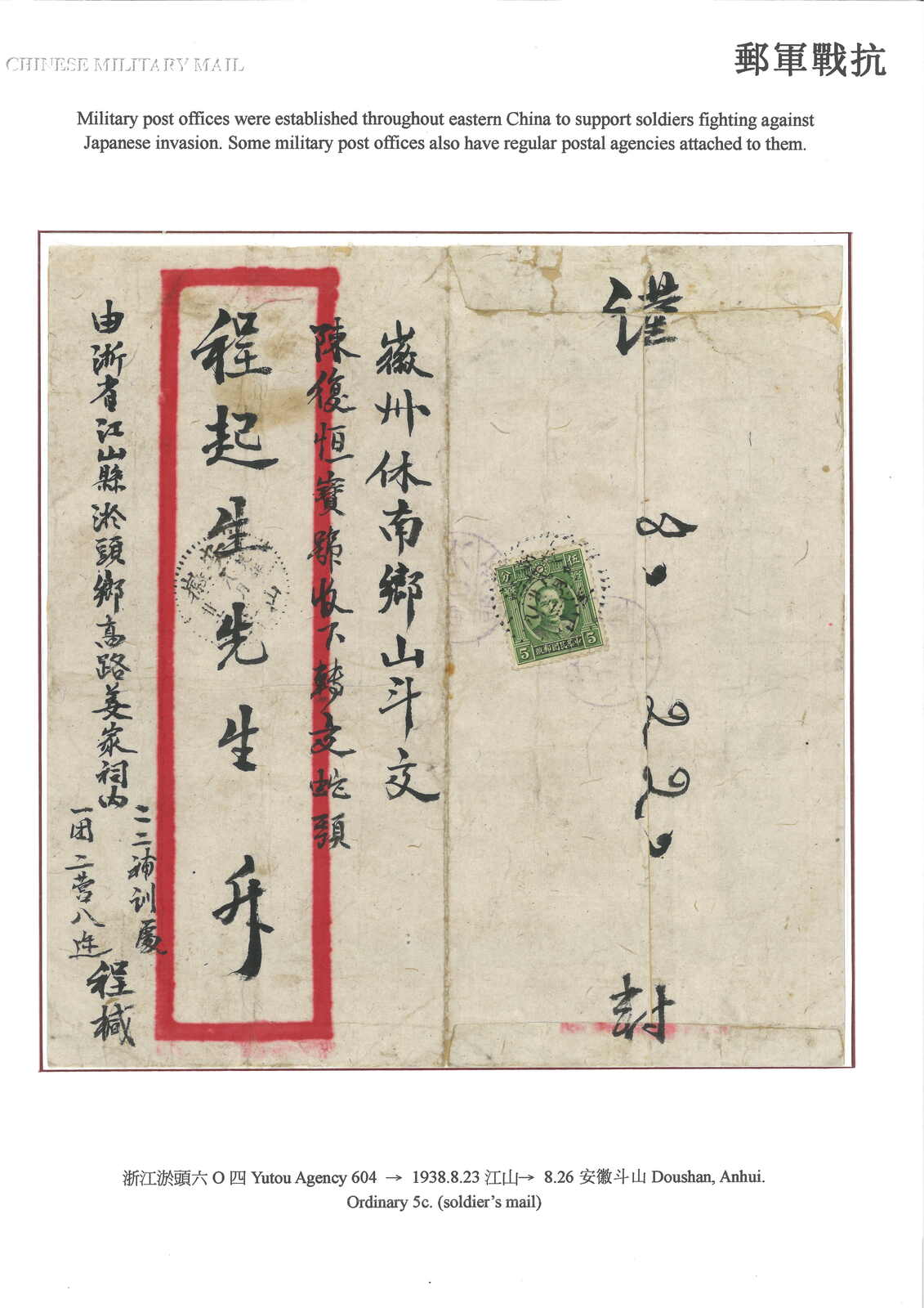 1938 (23 Aug) military cover from Yutow to Hweichow, applied with Yutow Agency No. 604 circular h.s. in violet. F.w. London Print SYS 5c on reverse, tied by Chikiang Kiangshan cds. Arrived Towshan (26 Aug). Cover opened out for