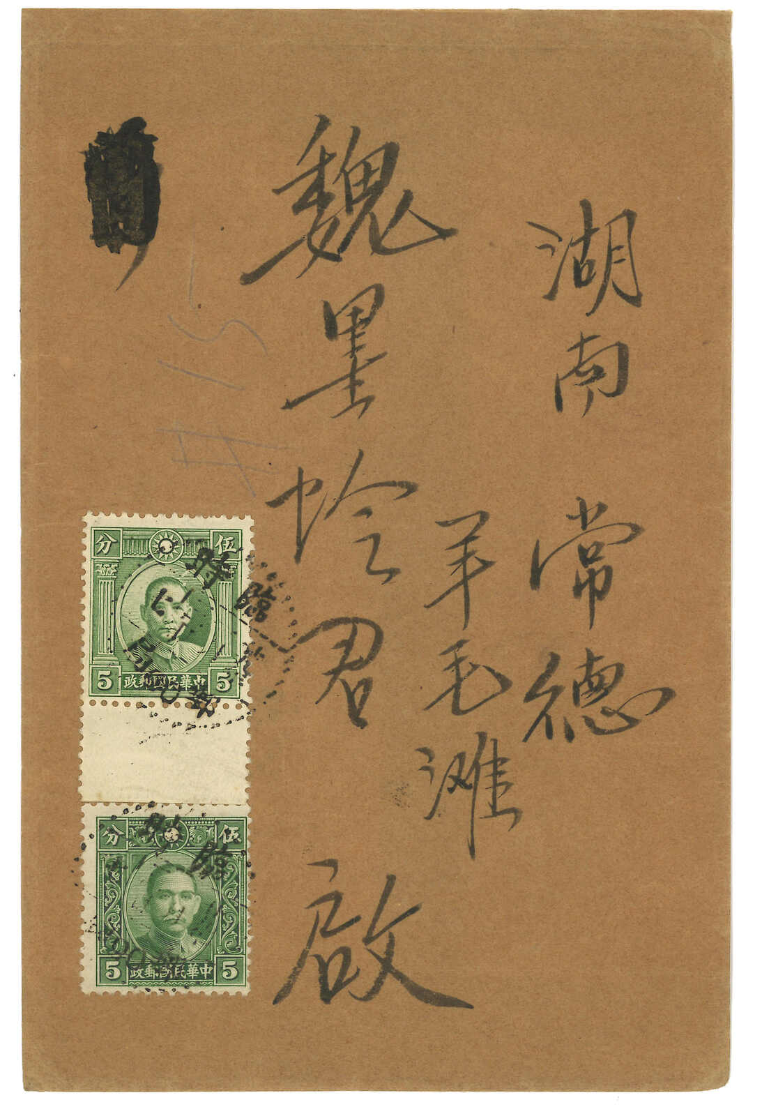 1940.1.3 軍郵封寄常德,正背貼烈士1分三連 + 孫像5分x2,銷臨時郵局90三格點線日戳。2.21抵常德。(Image 1)