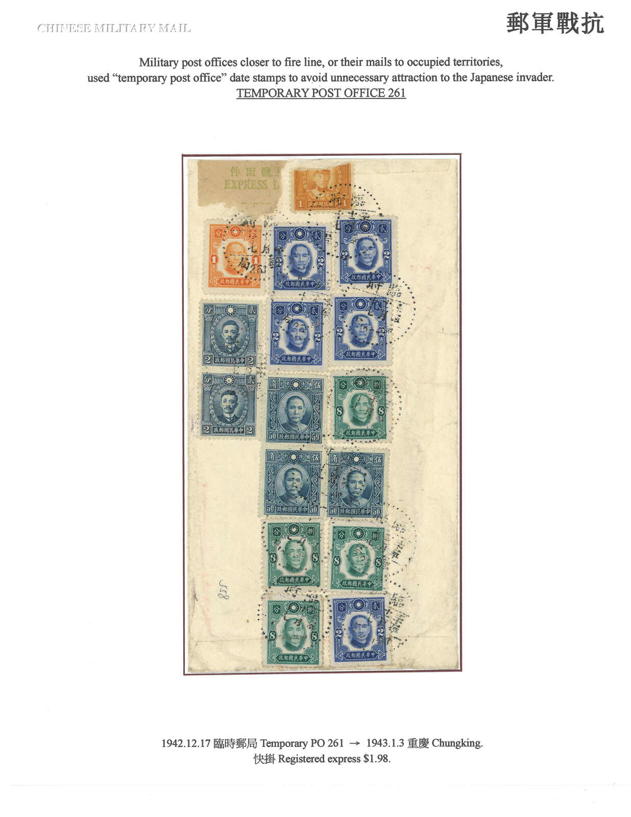 1942 (17 Dec) Military cover to Chungking, f.w. SYS and Martyrs x16 on reverse, in total of $1.98 express registered rate, tied by Temporary PO No. 261 cds. Arrived Chungking (3 Jan).