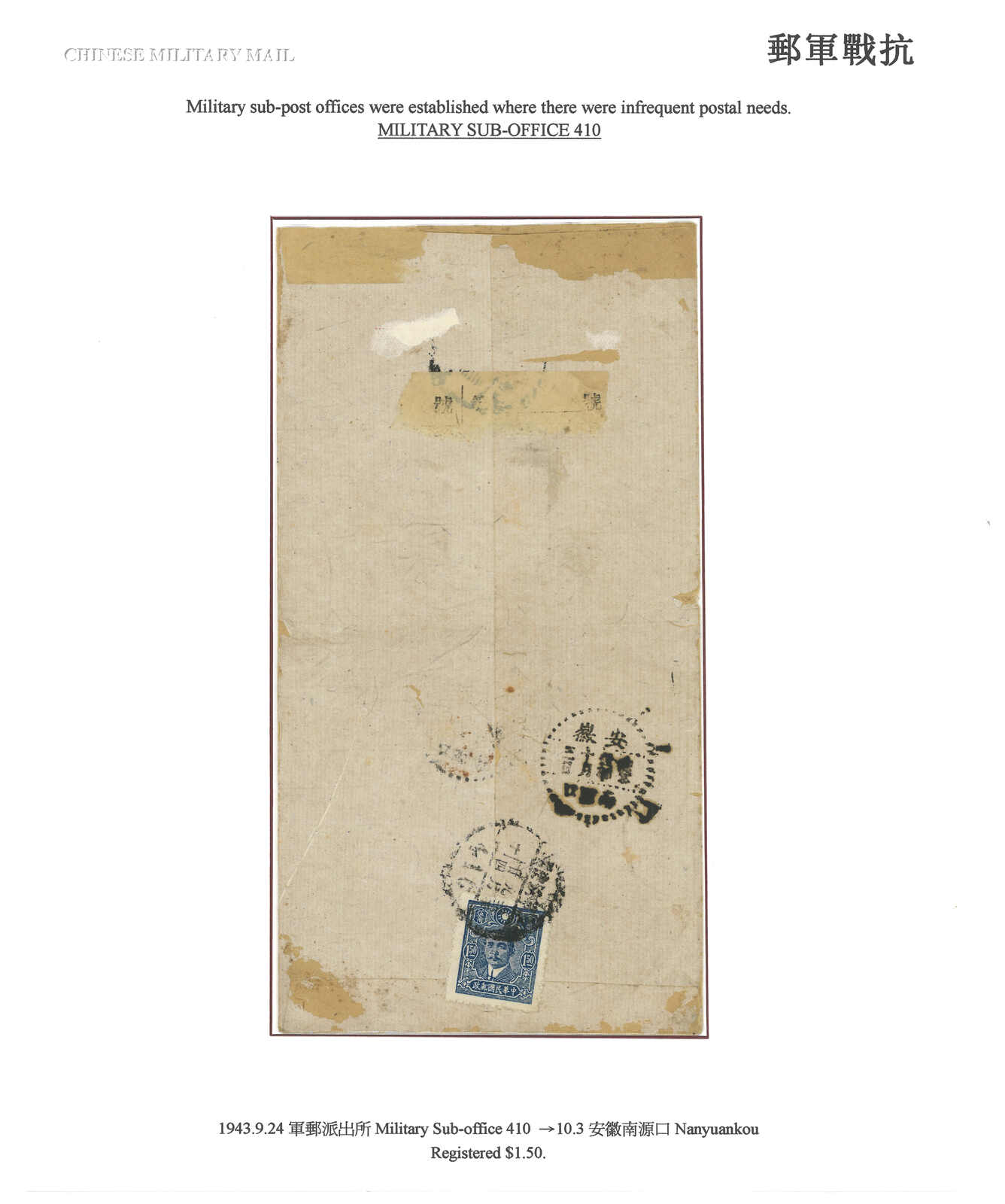 1943.9.24 軍郵封寄南源口,背貼中信版孫像1元5角,銷軍郵派出所410三格日戳。10.3抵安徽南源口。(Image 1)
