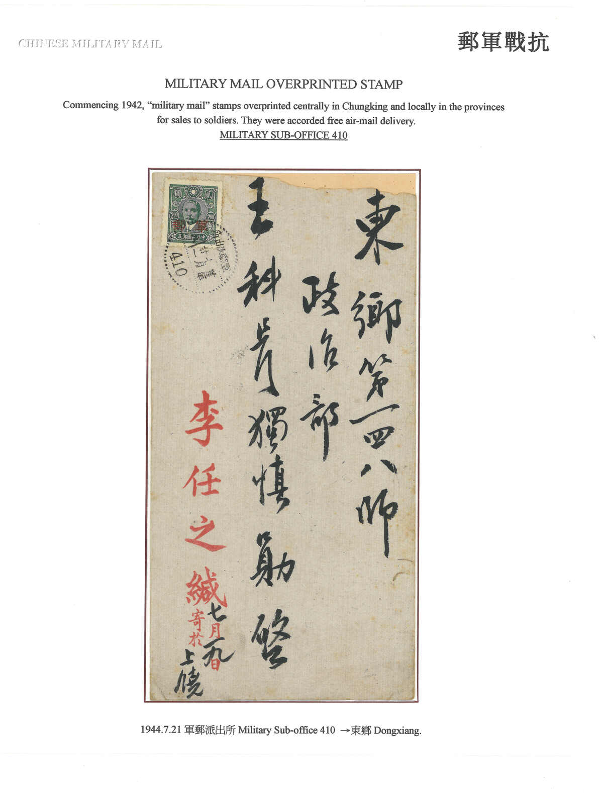 1944.7.21 軍郵封寄東鄉,貼孫像2元重慶加蓋軍郵(陳目M12),銷軍郵派出所410三格點線日戳。抵東鄉。(Image 1)