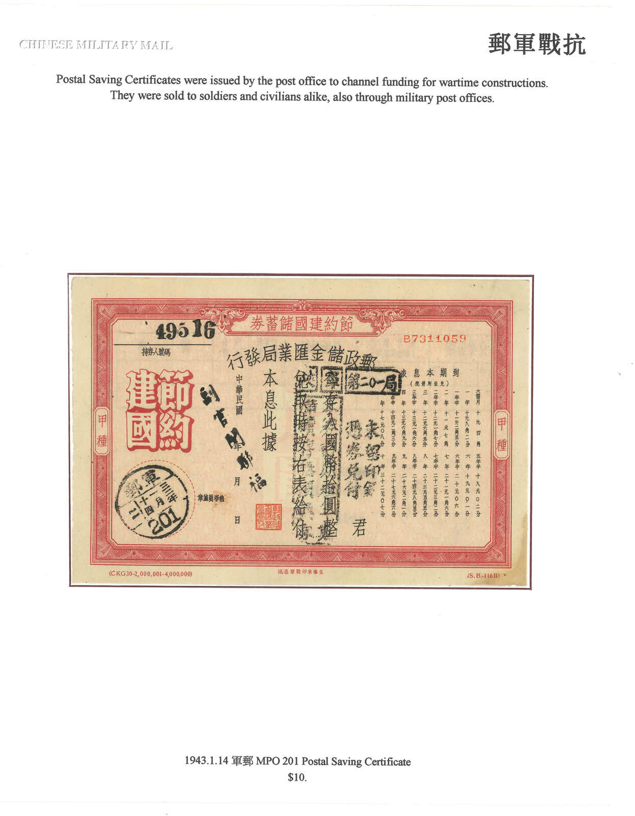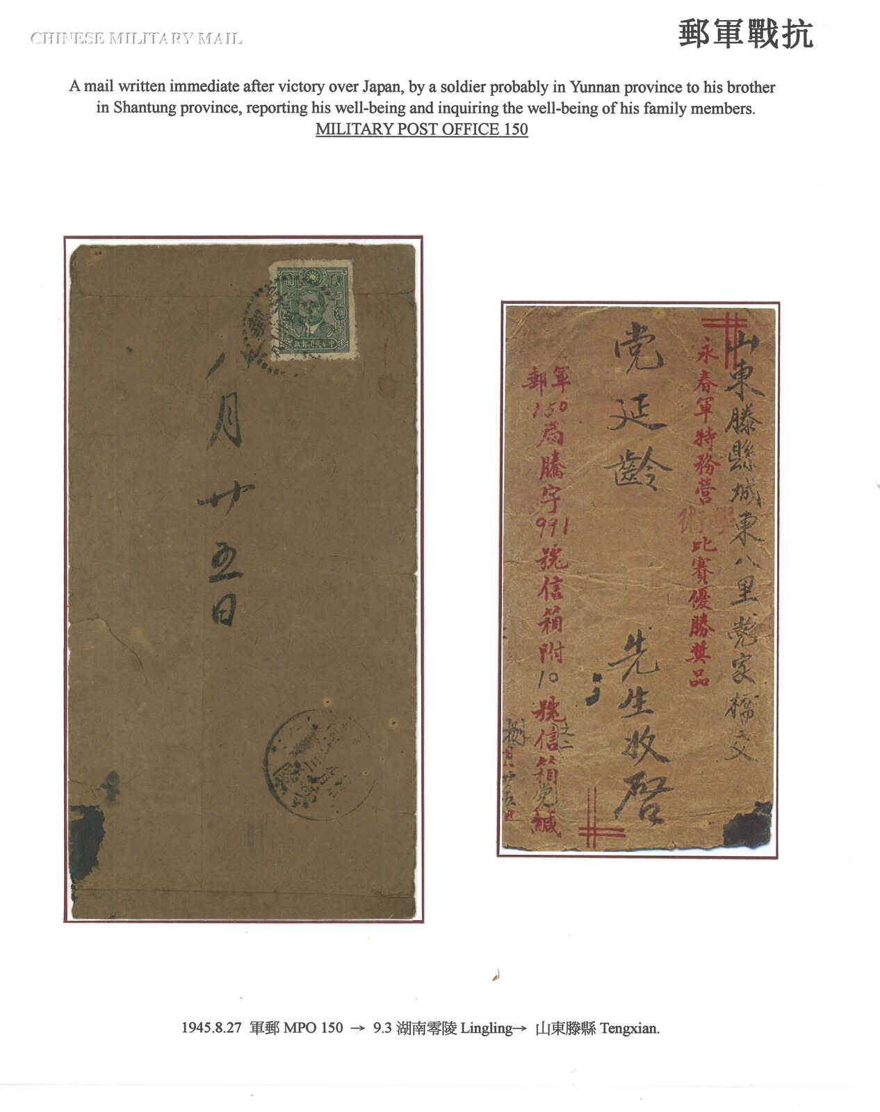 1945 (27 Aug) Military cover to Tenghsien, f.w. SYS $2, tied by Military PO No. 150 cds. Transit Lingling (3 Sep). Plus a 1943 (14 Jan) Thrift Movement saving certificate, applied with military PO 201 cds.
