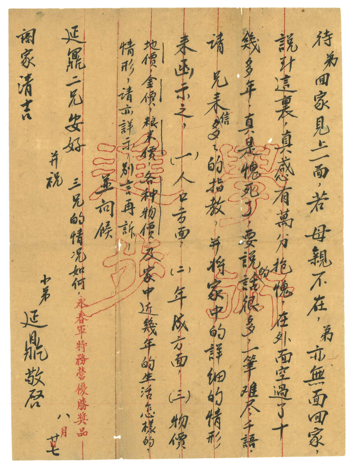 1942.8.17 軍郵封寄靈川,背貼烈士8分雙連,銷臨時郵局34三格點線日戳。8.19抵靈川。(Image 1)