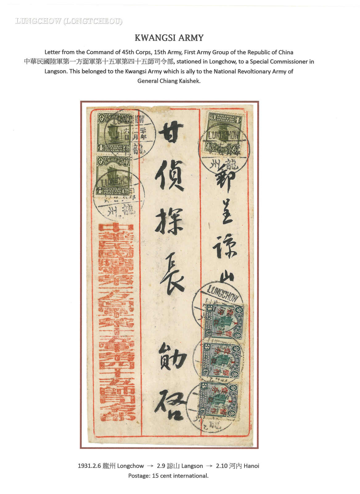 1931 (6 Feb) ROC Army 15th Army cover from Lungchow to French Indochina n, f.w. Junk x6, in total of 15c, tied by Lungchow bilingual cds. Transit Langson (2 Sep). Arrived Hanoi (10 Feb).