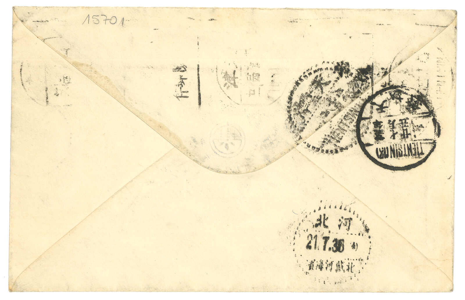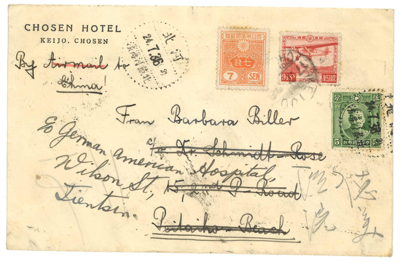 1936年朝鮮寄北戴河海灘,改寄天津,貼日本票7錢 + 航空票9錢半厘,銷京城日戳。7.21抵北戴河海灘但需改寄天津。貼孫像5分作國內郵資,銷北戴河海灘7.24日戳。同日抵天津。有趣。(Image 1)