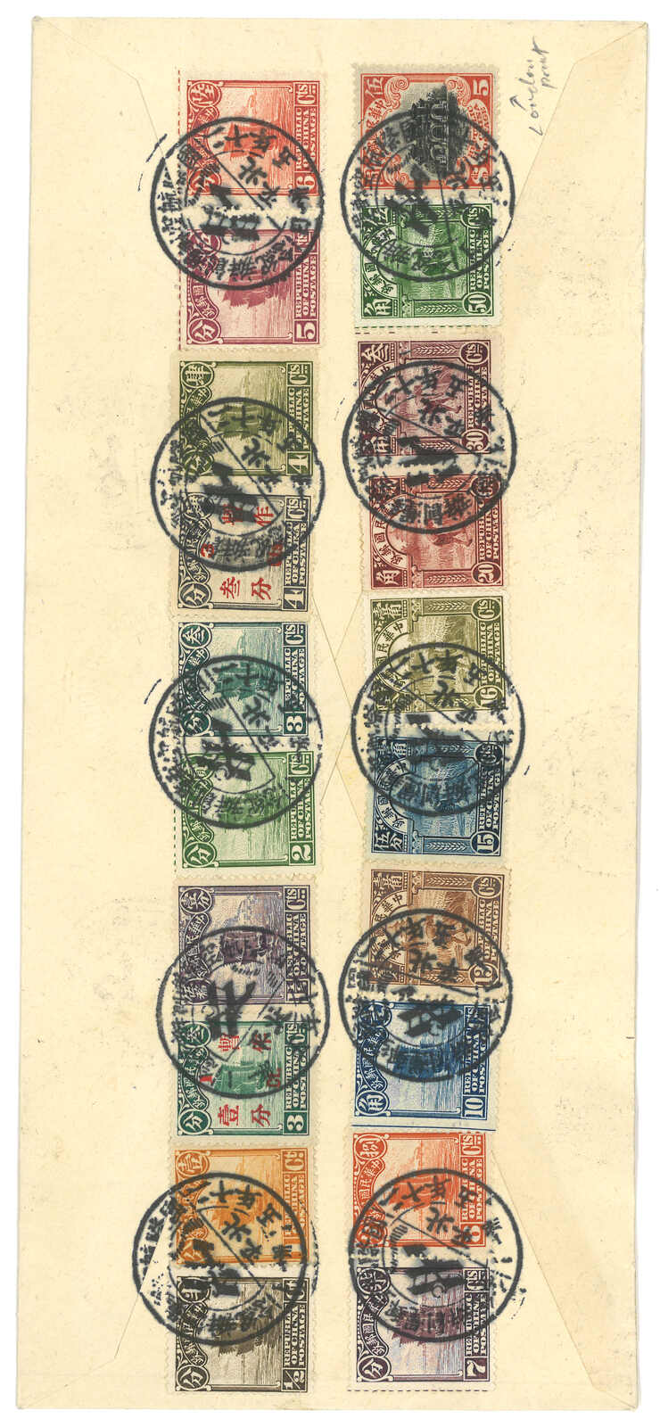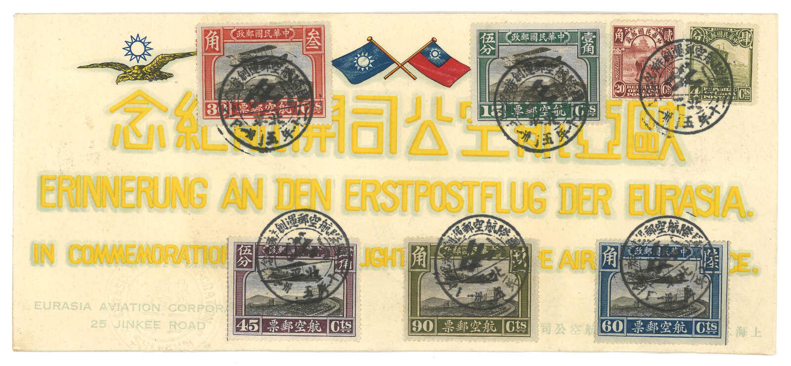 1931 (31 May) Inauguration of International Airmail Service commemorative cover, f.w. Peking 2nd print airmail issue complete set and Junk from 1/2c to $5, tied by Peiping commemorative cds. Nice franking.