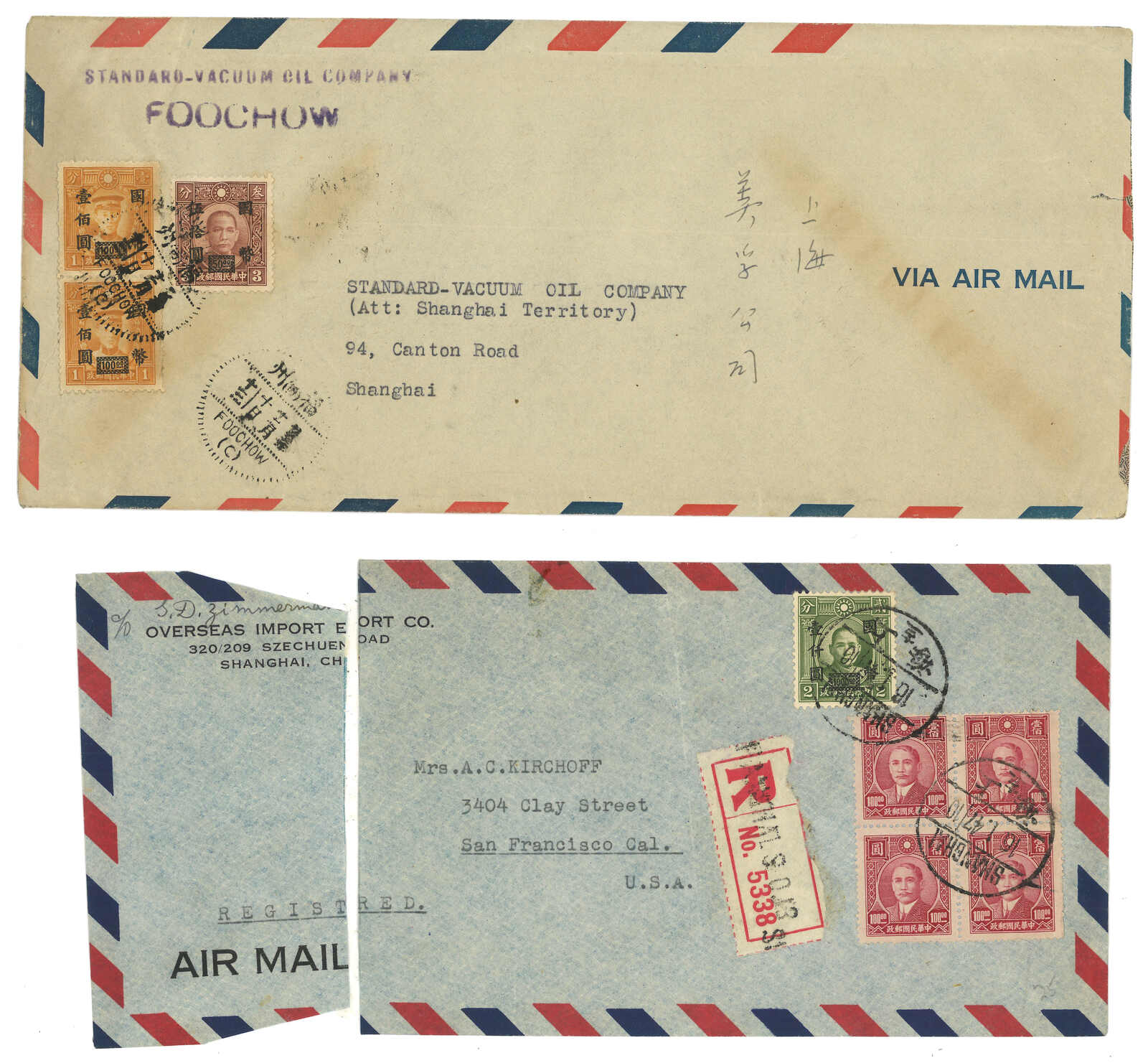1940s a group of 3 domestic and international airmail covers, f.w. SYS and its surch CNC issues, tied by Foochow and Shanghai cds respectively.