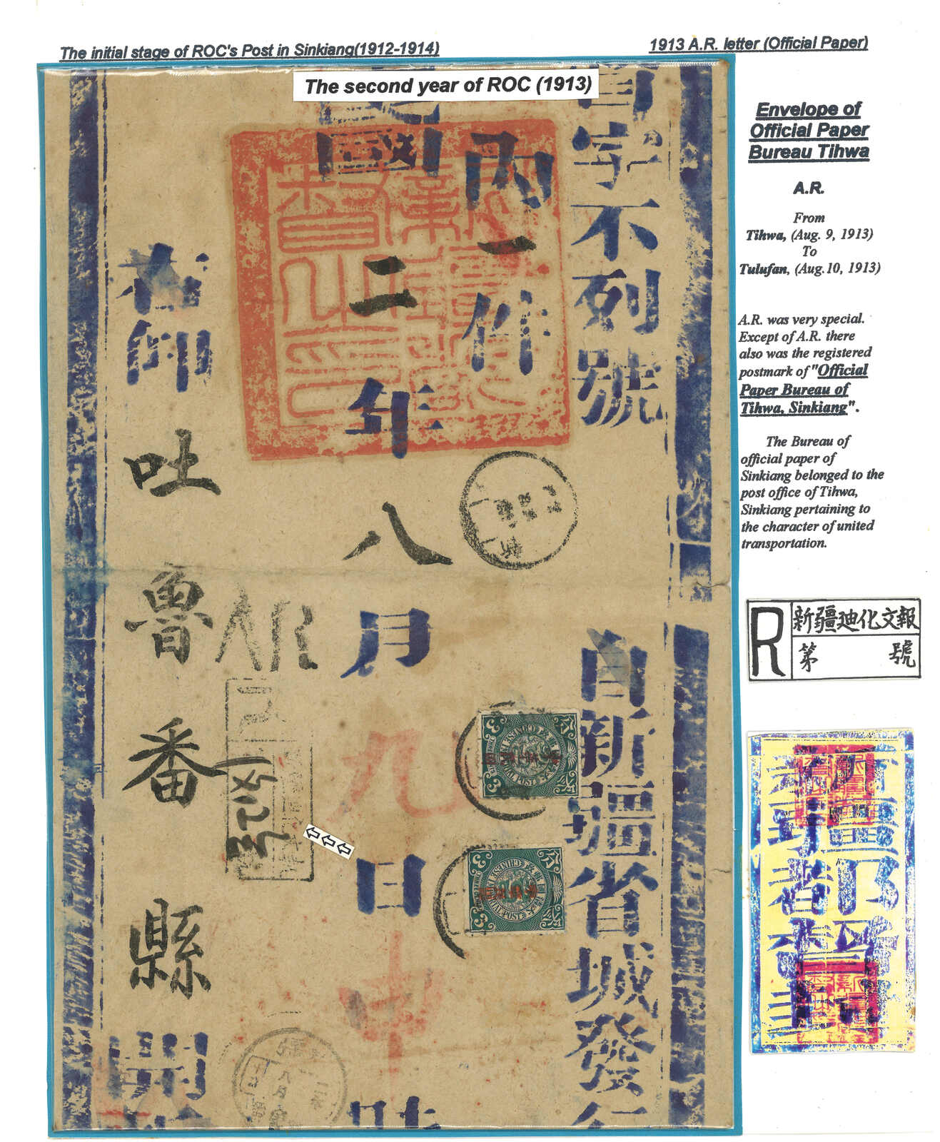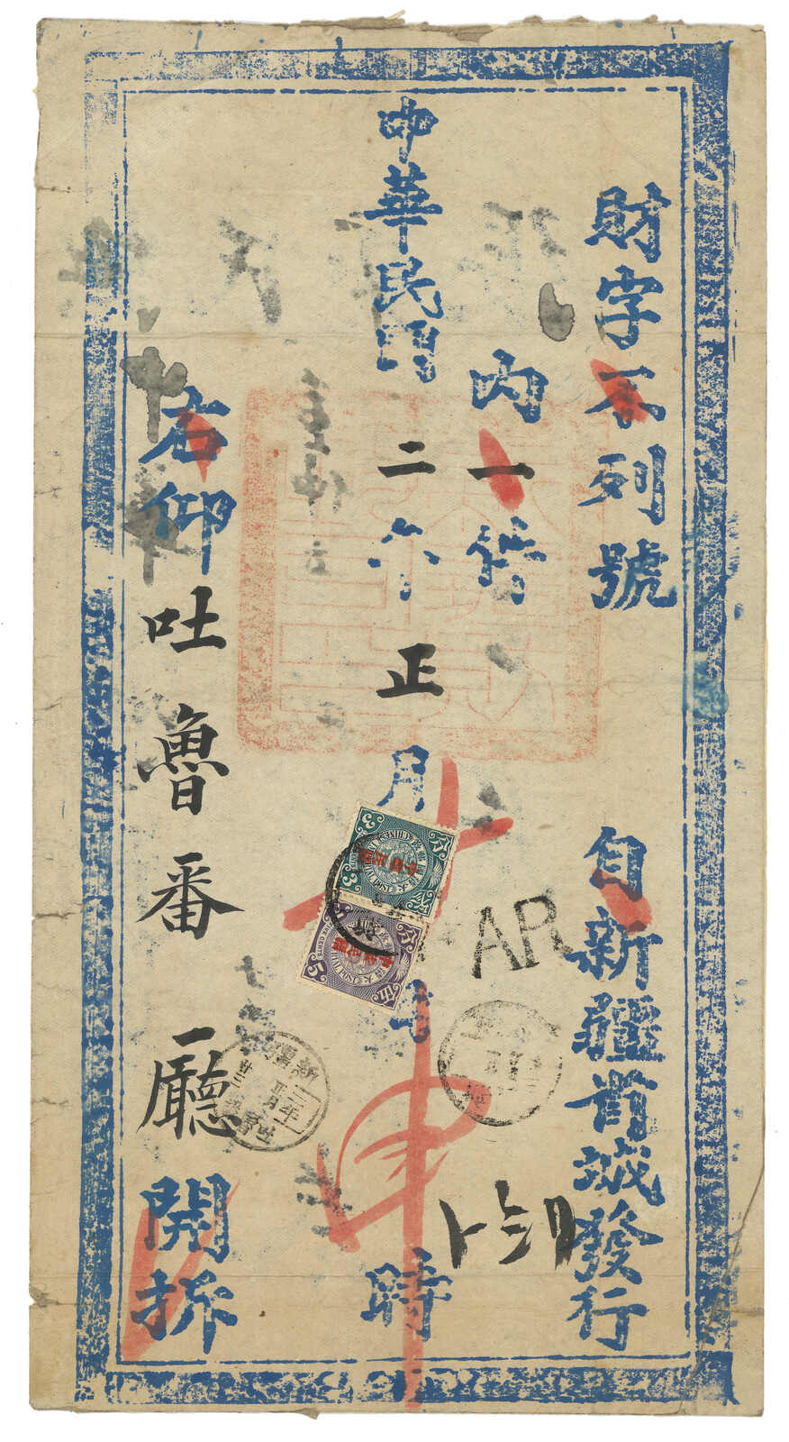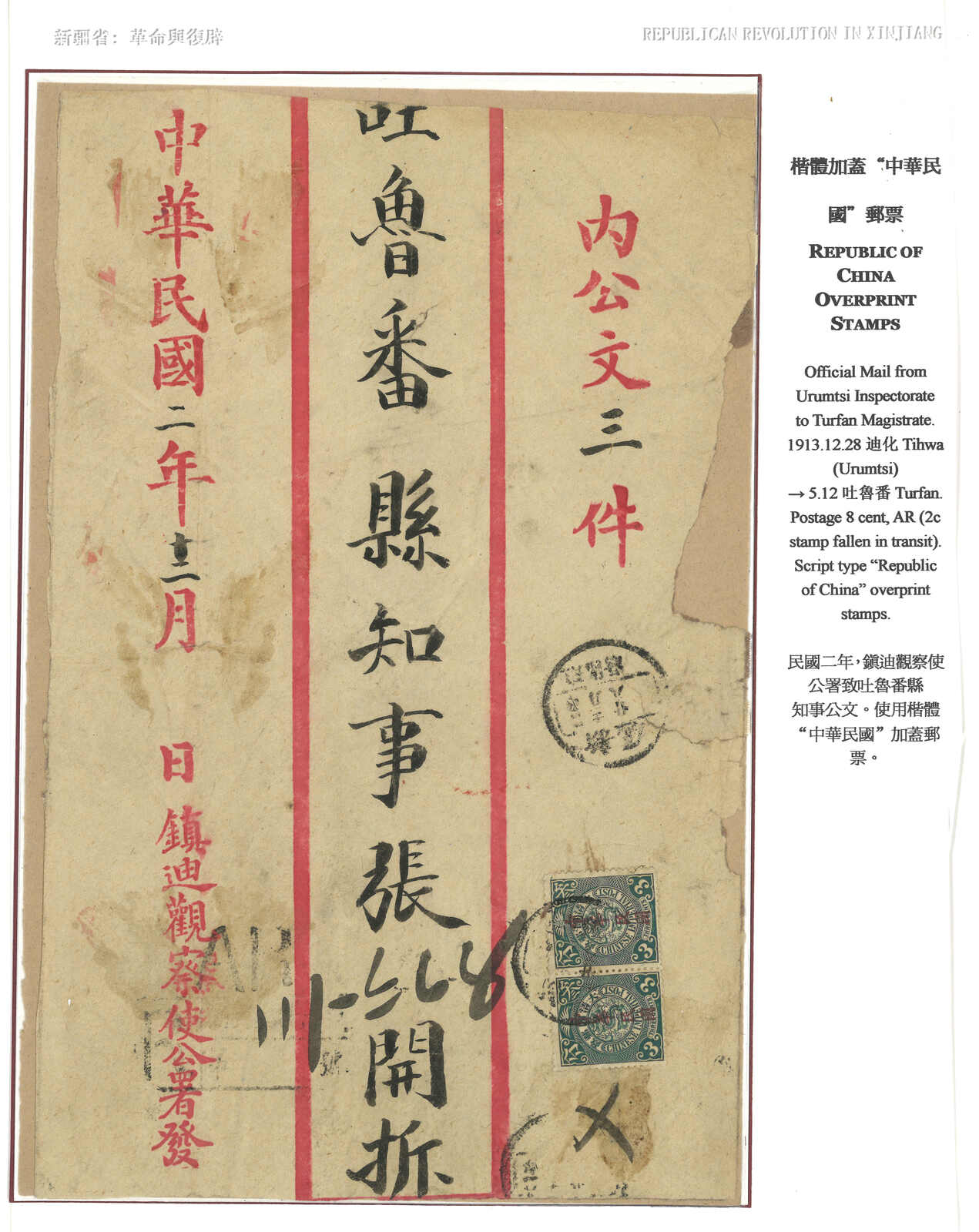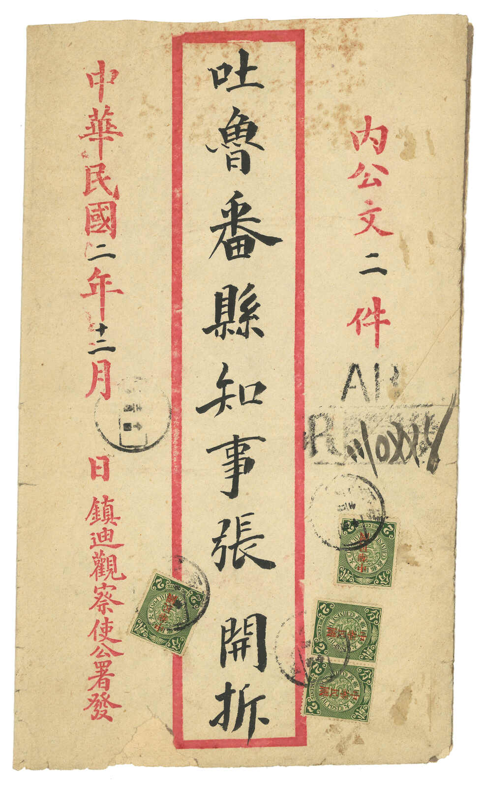 1913.3 迪化寄吐魯番。大型公文封,貼共和紀念3分 + 宋字蟠龍5分,銷新疆迪化府腰框日戳。另見AR章及掛號章。封有折,右上角缺損。由於光復和共和紀念票於1913年7月停售,加之新疆地方偏遠,故實寄例子極為少見。(Image 1) (Image 2) (Image 3)