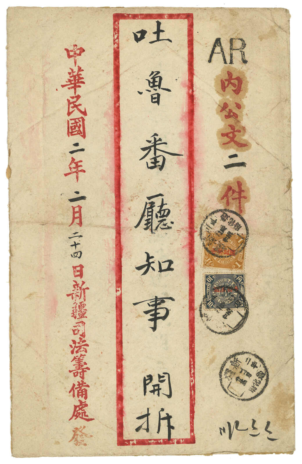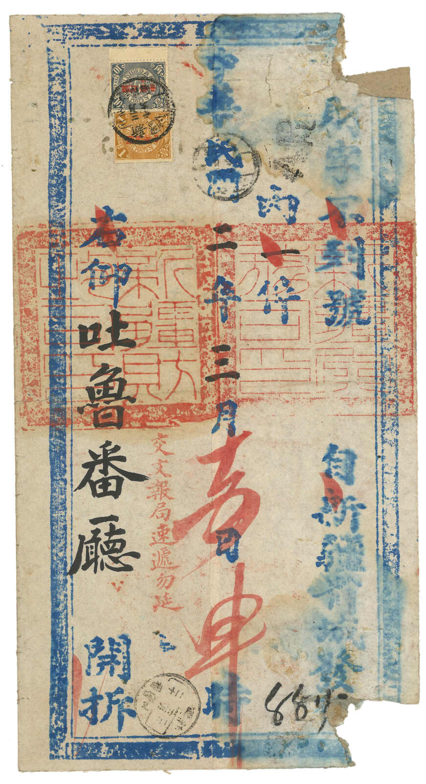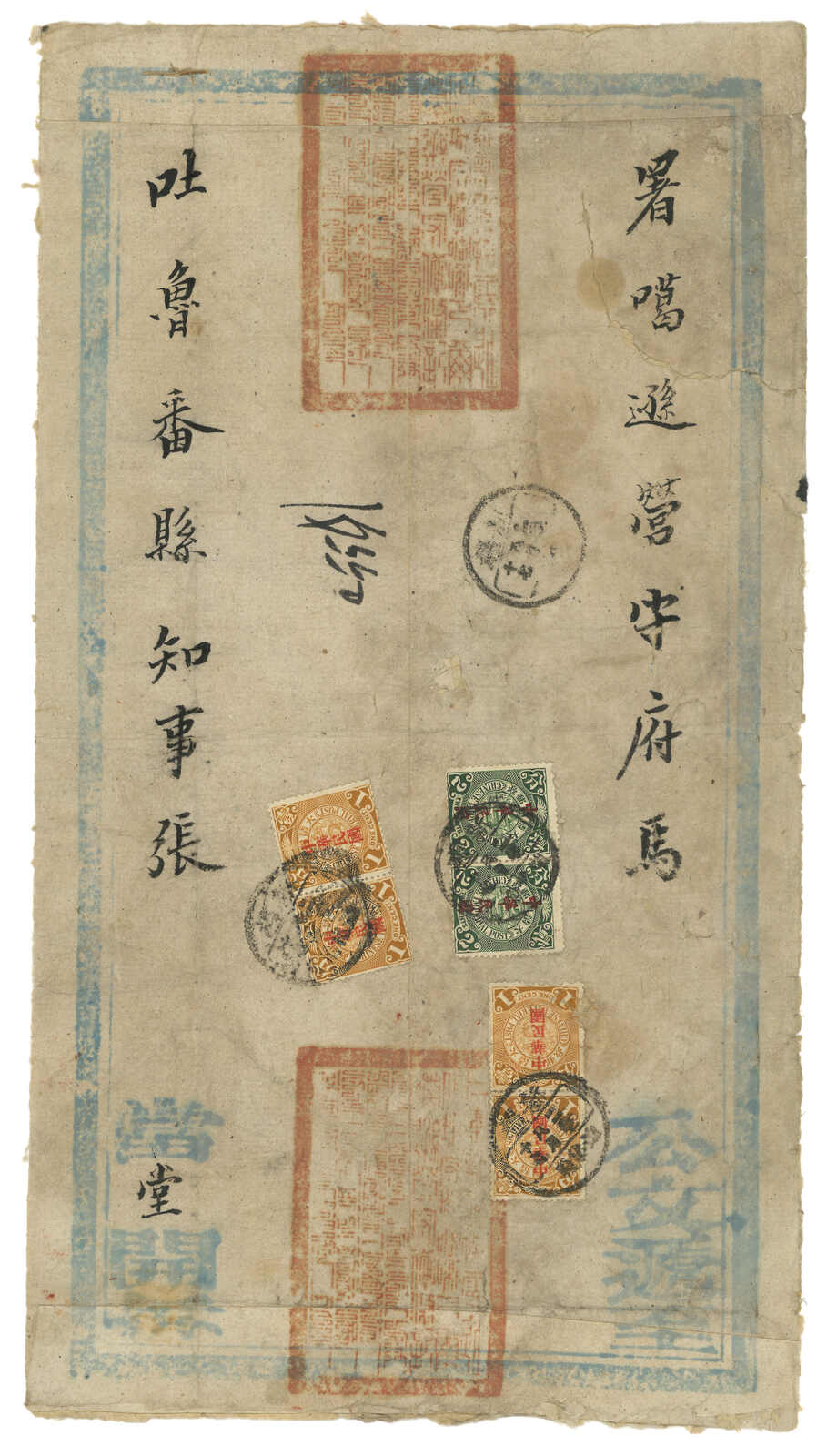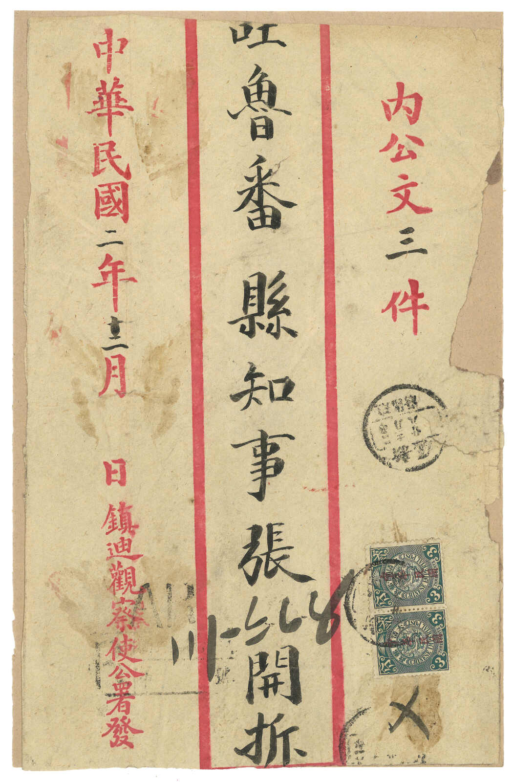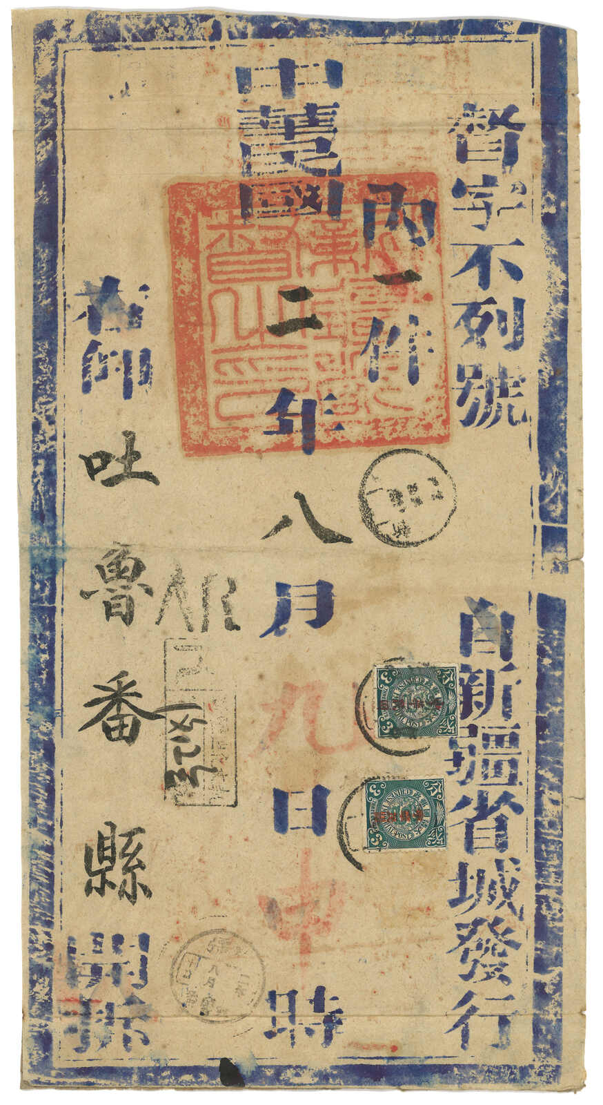 1913.3 迪化寄吐魯番。大型公文封,貼共和紀念3分 + 宋字蟠龍5分,銷新疆迪化府腰框日戳。另見AR章及掛號章。封有折,右上角缺損。由於光復和共和紀念票於1913年7月停售,加之新疆地方偏遠,故實寄例子極為少見。(Image 1) (Image 2) (Image 3)