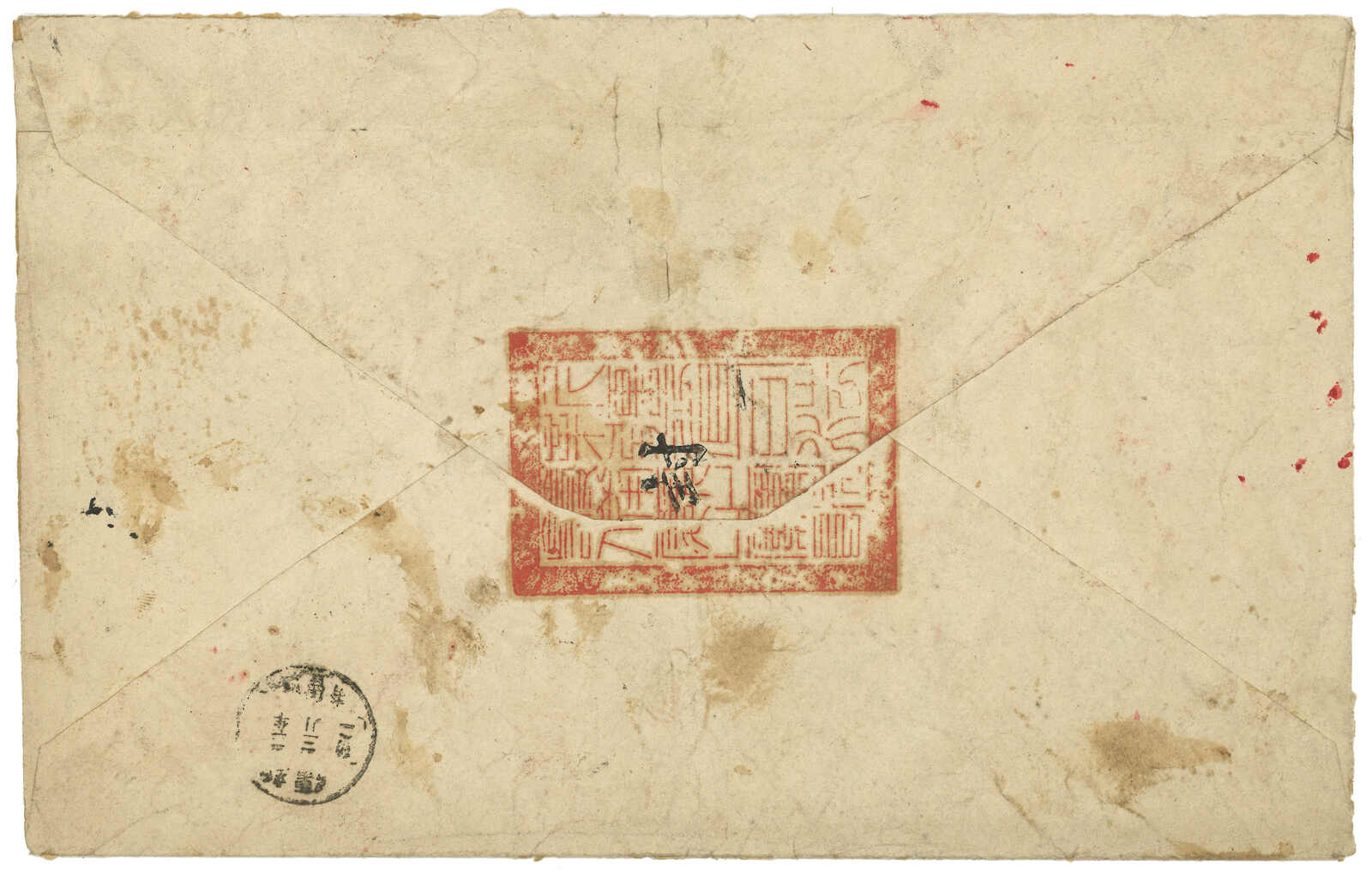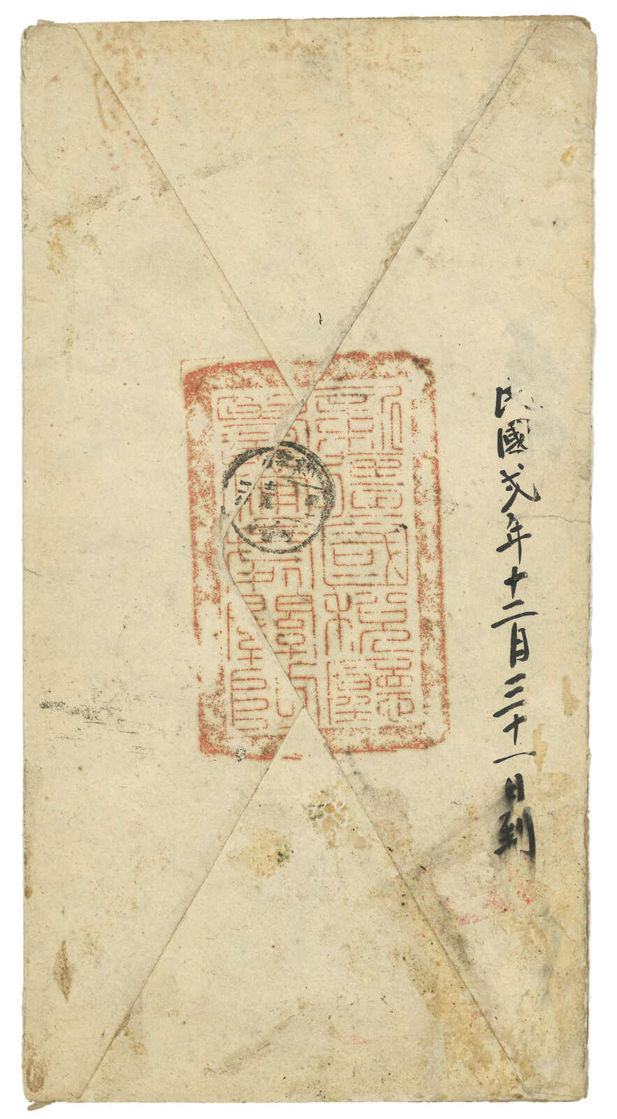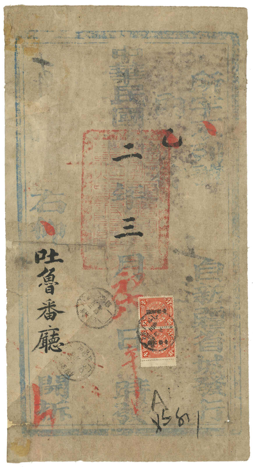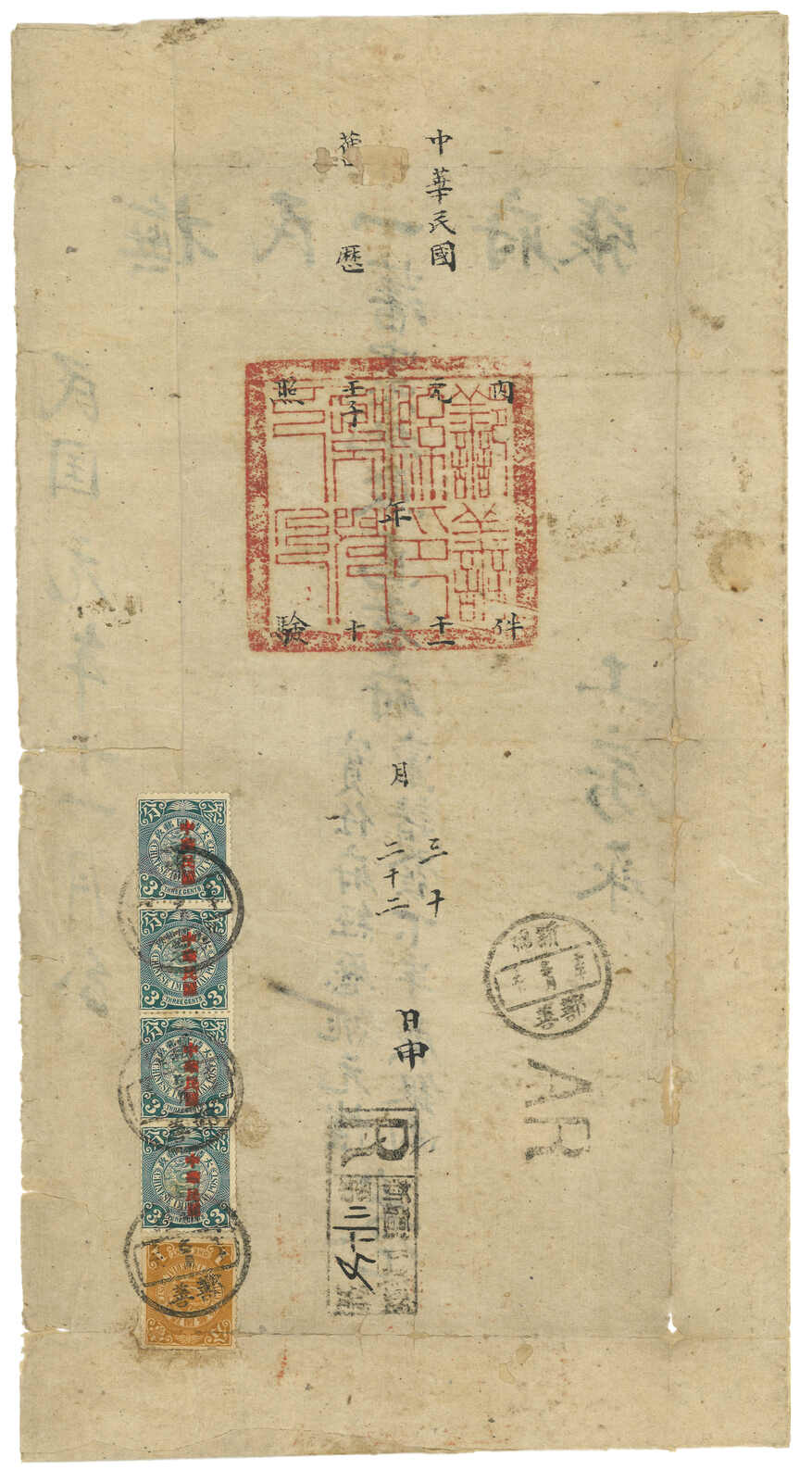1913.3 迪化寄吐魯番。大型公文封,貼共和紀念3分 + 宋字蟠龍5分,銷新疆迪化府腰框日戳。另見AR章及掛號章。封有折,右上角缺損。由於光復和共和紀念票於1913年7月停售,加之新疆地方偏遠,故實寄例子極為少見。(Image 1) (Image 2) (Image 3)