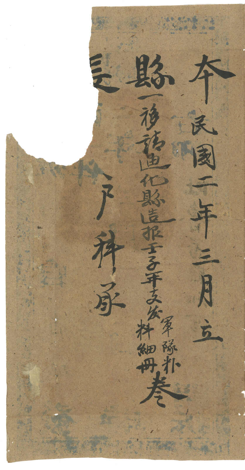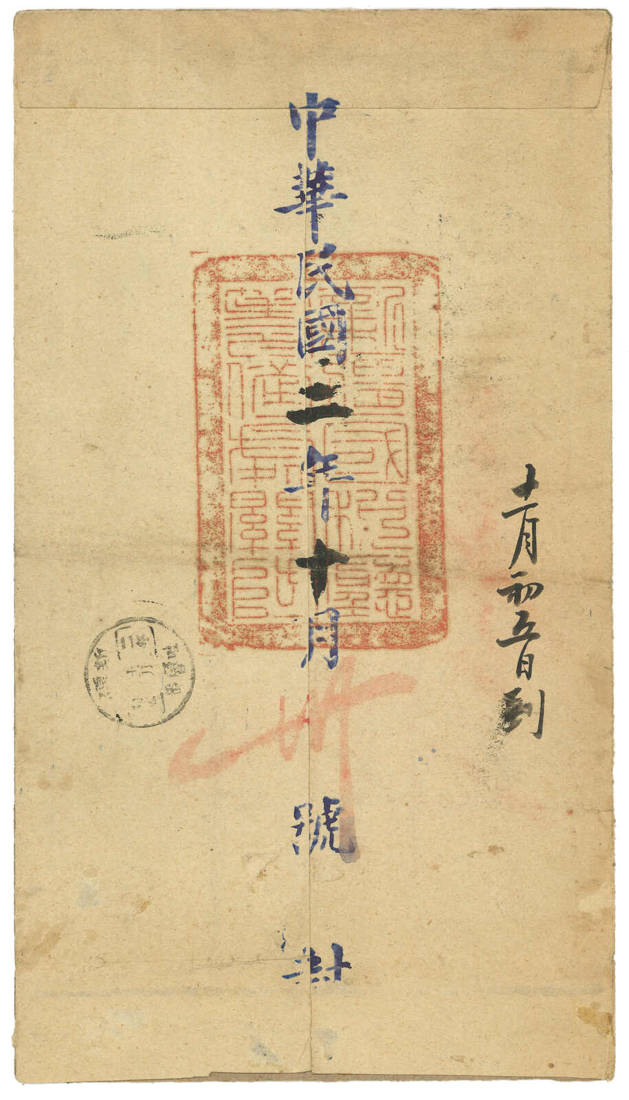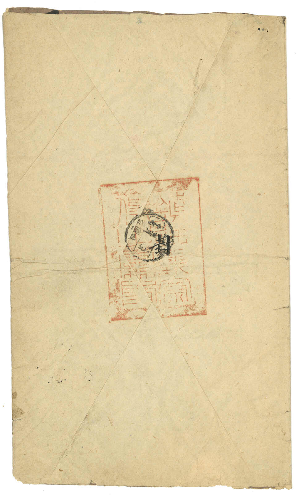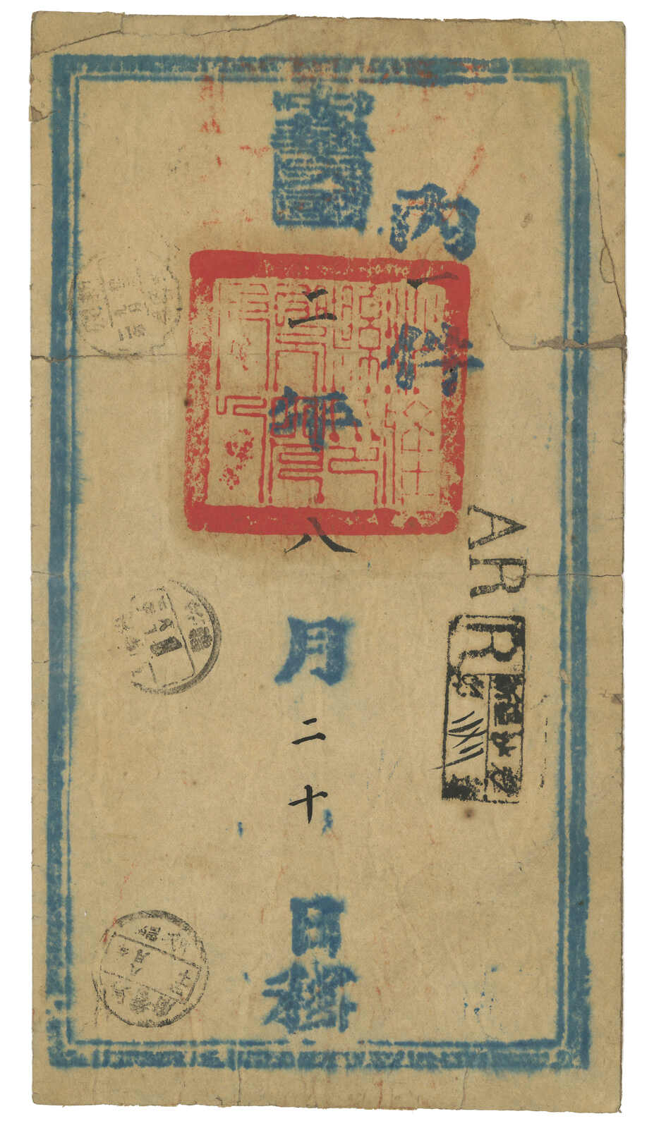 1913.8.25 沙雅寄吐魯番。大型公文封,無貼票,鈐沙雅始發日戳、AR章及掛號章。此封採用公文掛號聯單交案制度,即零寄整付,故無貼票。此為最早之沙雅寄出郵例,兼最晚之新疆文報局無貼票例子。封帶裂口。(Image 1) (Image 2)