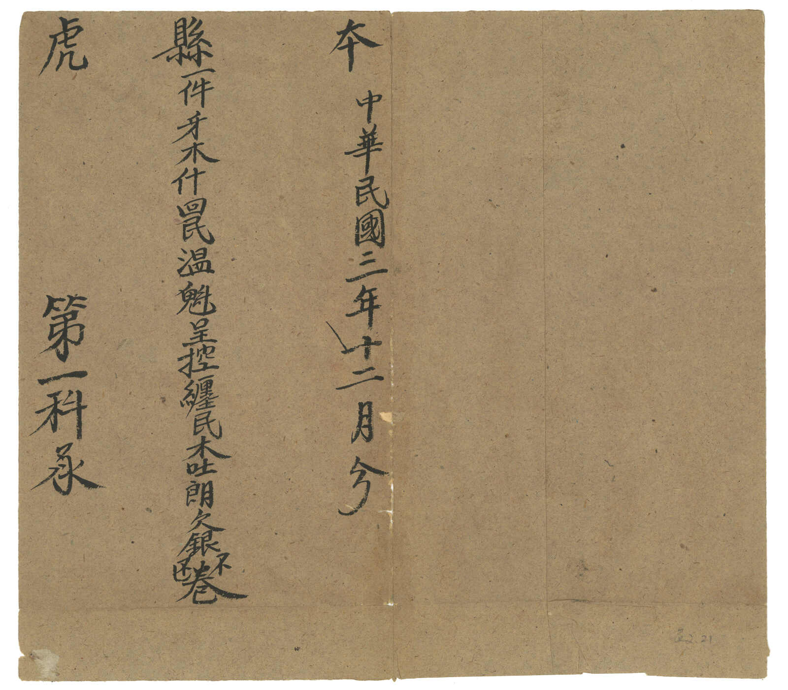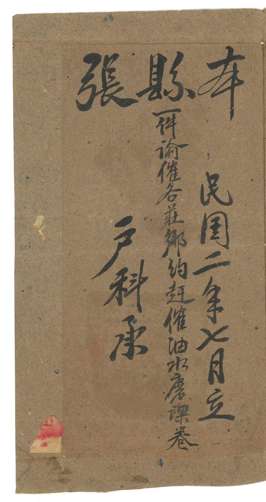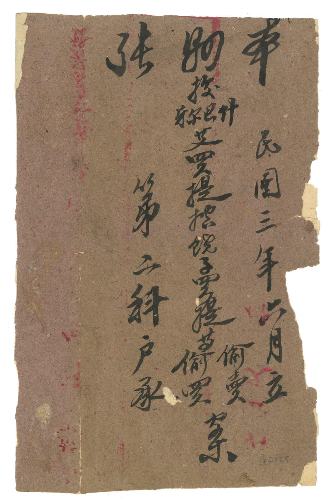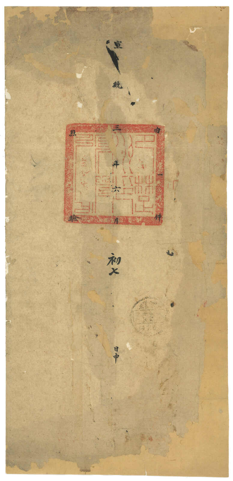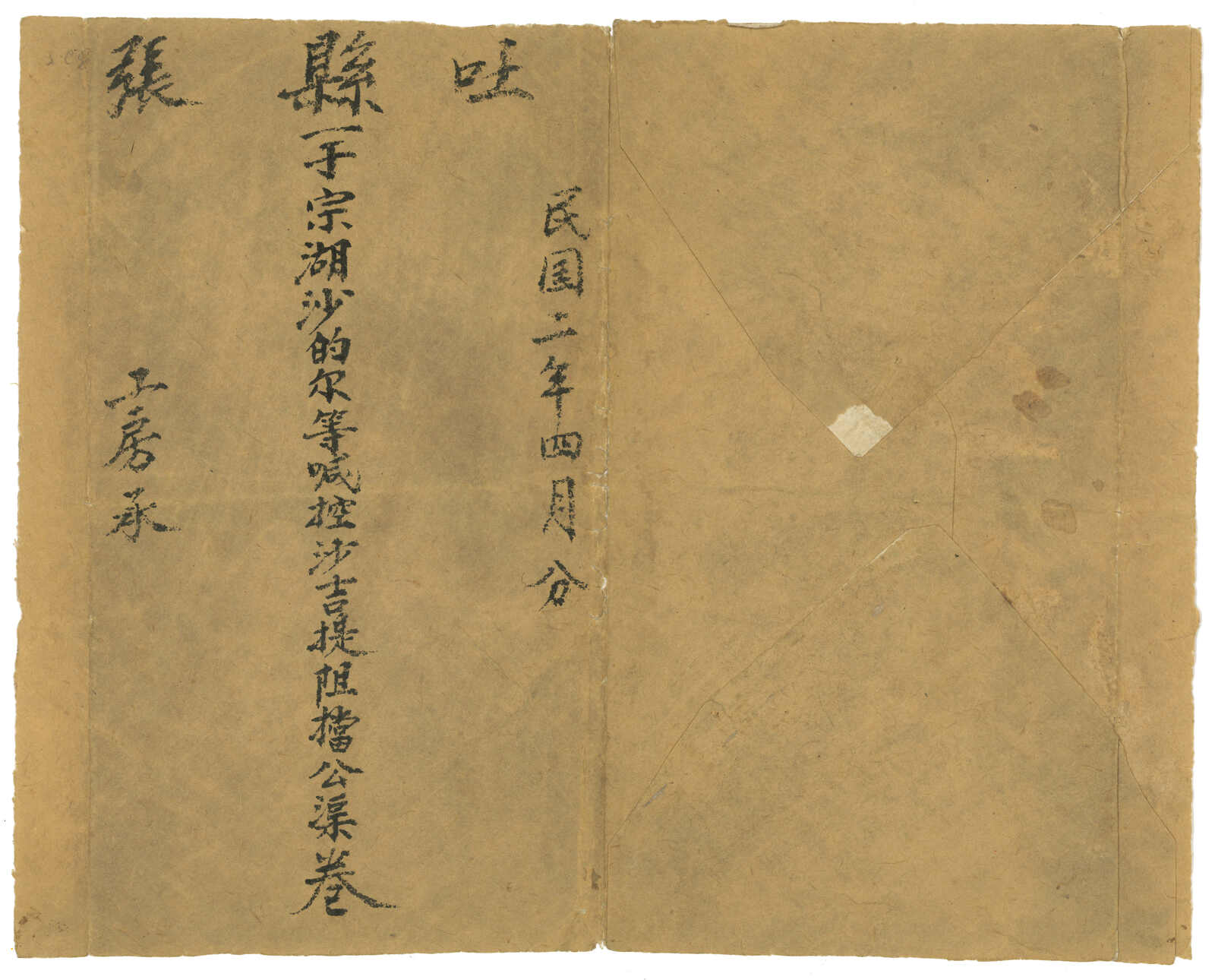 1913.8.25 沙雅寄吐魯番。大型公文封,無貼票,鈐沙雅始發日戳、AR章及掛號章。此封採用公文掛號聯單交案制度,即零寄整付,故無貼票。此為最早之沙雅寄出郵例,兼最晚之新疆文報局無貼票例子。封帶裂口。(Image 1) (Image 2)
