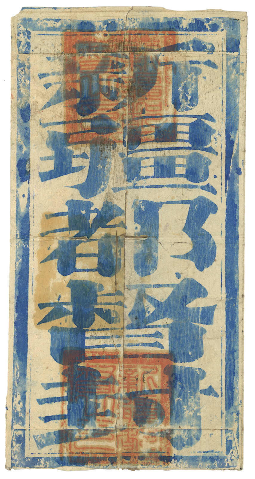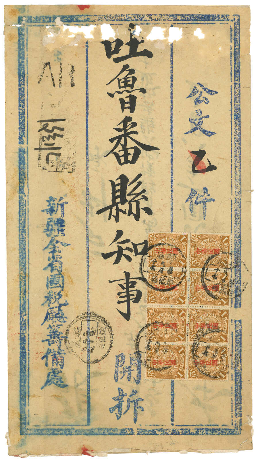 1913.8.17 迪化寄吐魯番。大型公文封,貼大國字蟠龍1分八方連,銷迪化府腰框日戳,旁鈐AR章及“新疆迪化文報”掛號章。8.22抵吐魯番。封頂帶蟲洞。雖僅貼單掛號郵資,但因公文而獲雙掛號待遇。(Image 1) (Image 2)