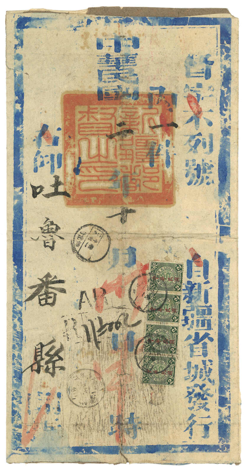 1912.11.30 鄯縣寄吐魯番。大型公文封,貼未加蓋蟠龍1分 + 宋字蟠龍3分直四連,銷新疆鄯縣腰框日戳,旁見AR章及掛號章。12.2抵吐魯番。此為貼用民國蟠龍票之最早新疆郵件。貼付雙掛號郵資亦較少見,因為大部分相似公文例子都貼用單掛號郵資便可享雙掛號服務。(Image 1) (Image 2) (Image 3)