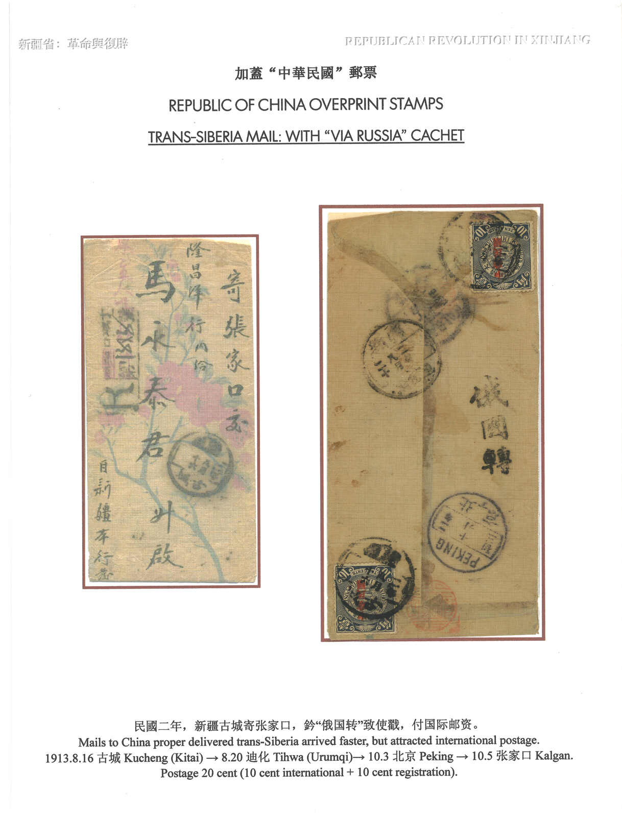 3129 cover image1913 Kucheng (16 Aug) to Kalgan via Siberia, f.w. Coiling Dragon Statistical Dept ovpt. ROC 10c x2 for international registered letter rate, tied by Sinkiang Kucheng cds. Along with "Via Russia" cachet. Transit Tihwa (20 Aug), Peking (3 Oct). Arrived Kalgan (5 Oct).