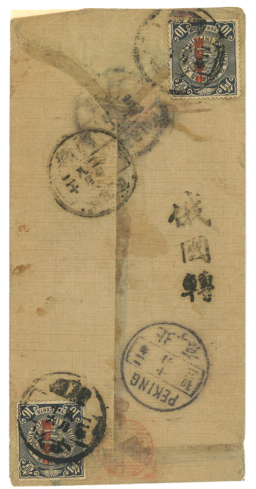 3135 cover image1913 Tihwa (27 Dec) to Turfan. Large official cover, f.w. Coiling Dragon Commerical ovpt. 1c x4 + London ovpt. 2c in pair, tied by Sinkiang Tihwa cds, along with AR mark and registered mark. Arrived Turfan (31 Dec). Although only registered rate was paid, double registration service was provided given due to official mail. Cover folded and corner damaged.