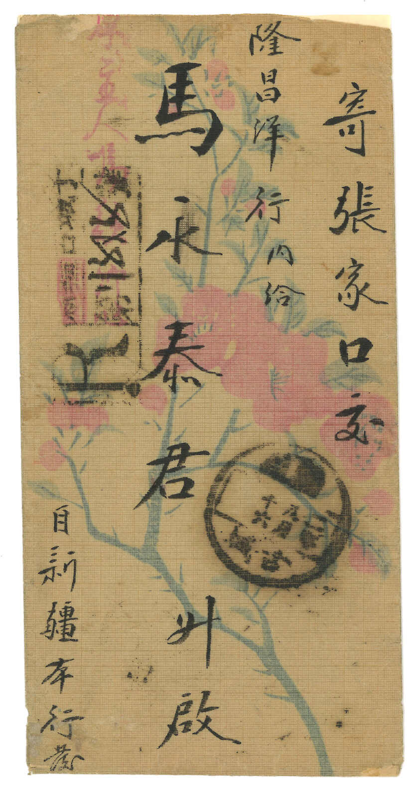 3126 cover image1913 Tihwa (16 Mar) to Turfan via Wenbaoju. Large official cover, f.w. Coiling Dragon Commercial ovp. ROC 1c + Statistical Dept ovpt. ROC 10c, tied by Sinkiang Tihwa cds., alongside with "Forward to Wenbaoju, Express Delivery No Delay" cachet and AR mark. Arrived Turfan (19 Mar). This Wenbaoju cachet is much rarer than the later "Sinkiang Tihwa Wenbao" registered mark. Probably only several examples exist. Cover folded and corner damaged.