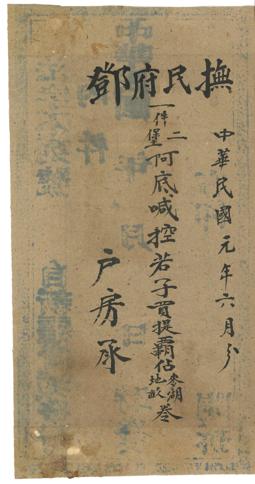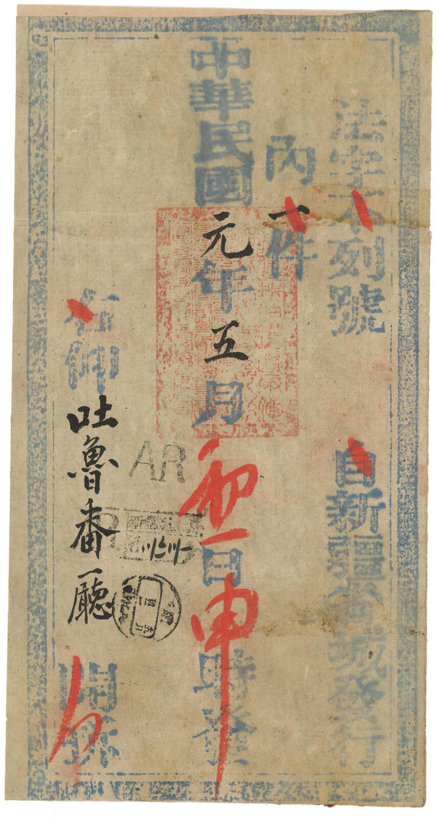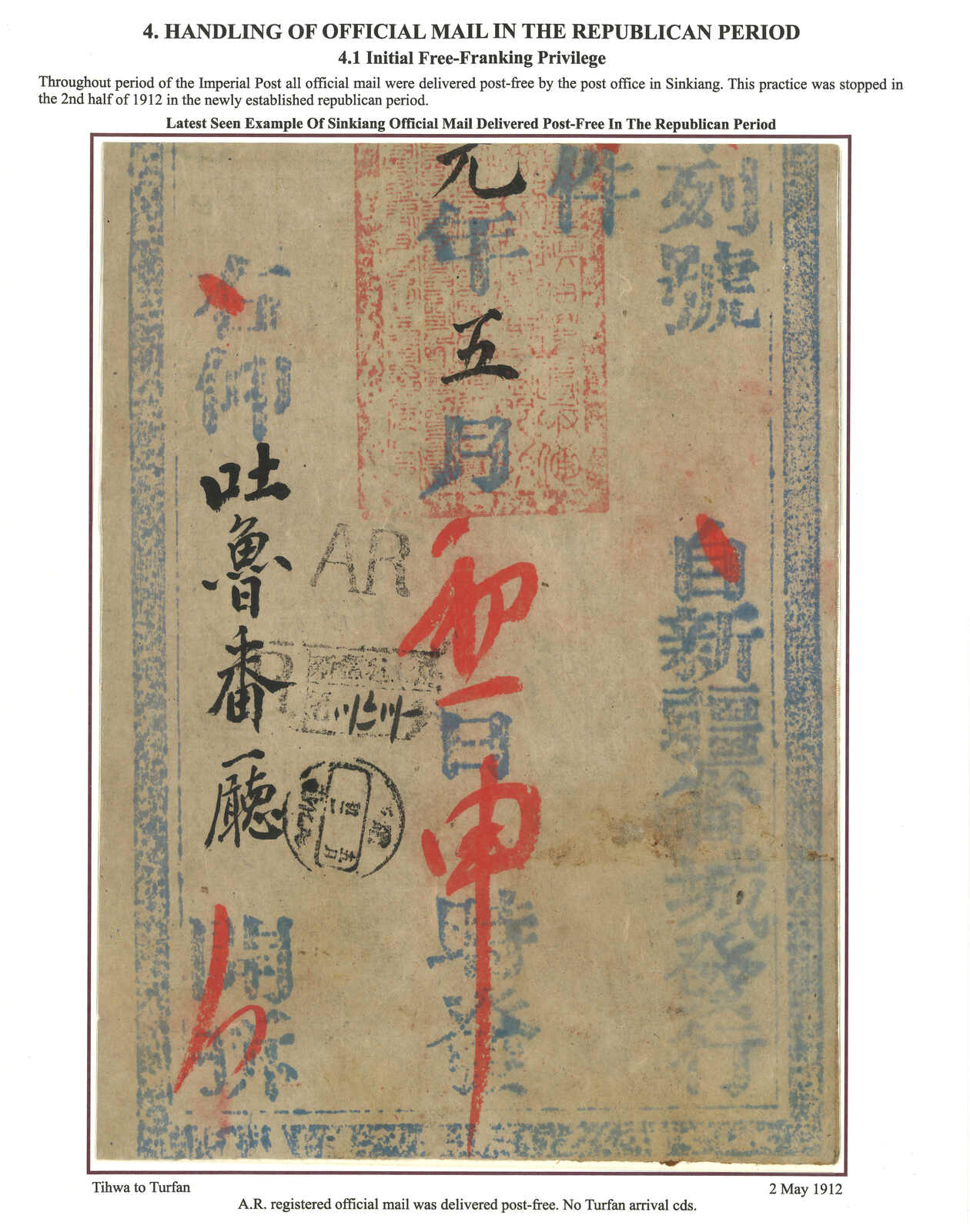 1912.5.2 迪化寄吐魯番。大型公文封,無貼票,鈐迪化始發日戳、AR章及掛號章。此封採用公文掛號聯單交案制度,即零寄整付,故無貼票。此為第二晚之新疆文報局無貼票例子。(Image 1) (Image 2) (Image 3)