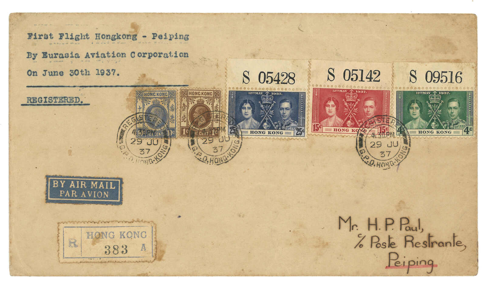 1937.6.29 歐亞航空香港-北平首航封,貼香港佐治六世加冕全帶上數字邊 + 佐治五世1仙 + 10仙,銷香港總局掛號日戳。7.3抵北平。(Image 1) (Image 2)