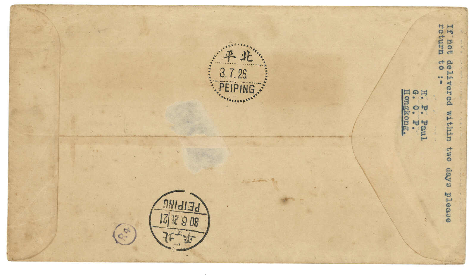 1640 cover image1937 (29 Jun) Eurasia Hong Kong-Peiping FFC, f.w. Hong Kong KGVI Coronation complete set with top margin + KGV 1c + 10c, tied by Hong Kong GPO registered cds. Arrived Peiping (3 Jul).