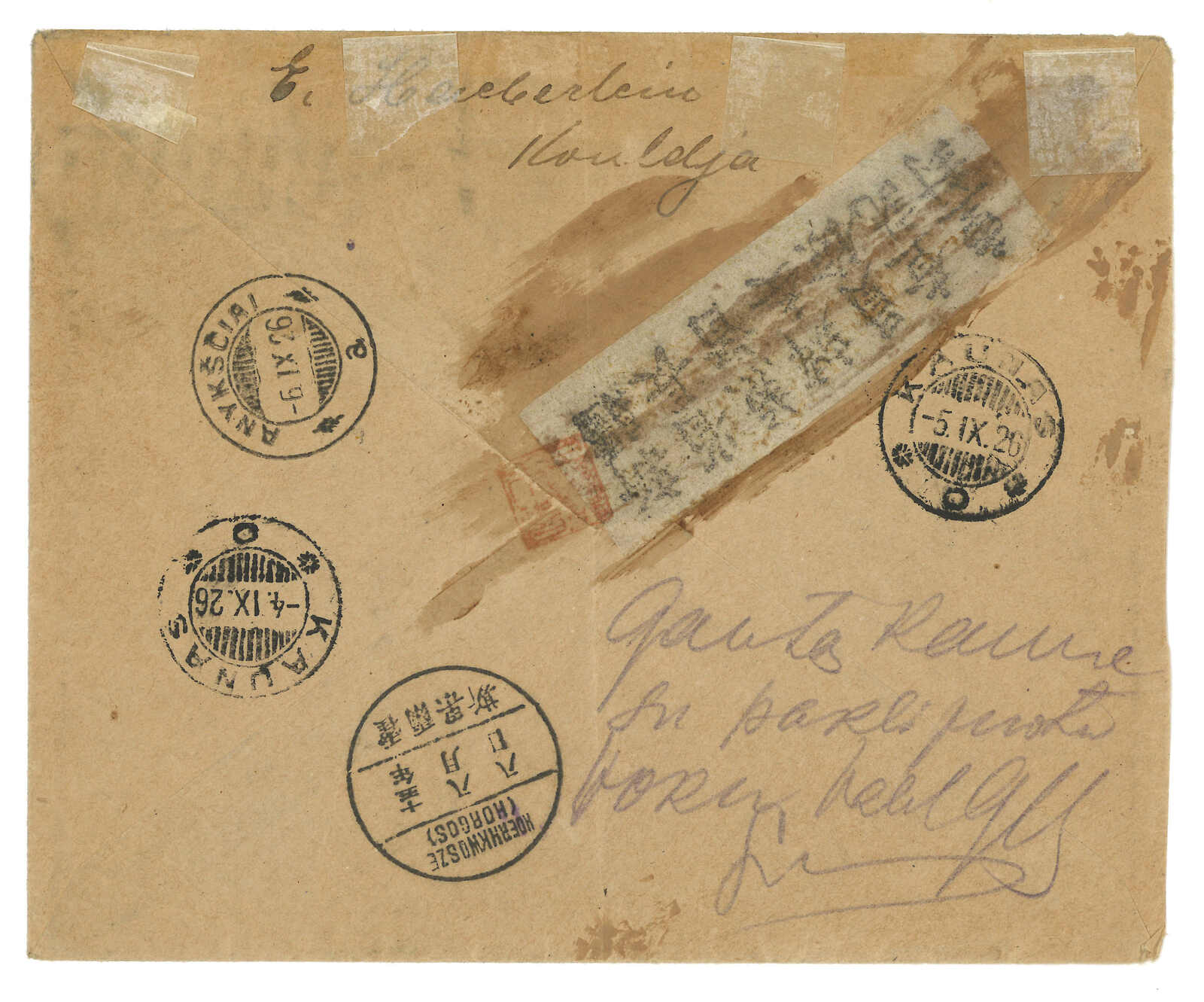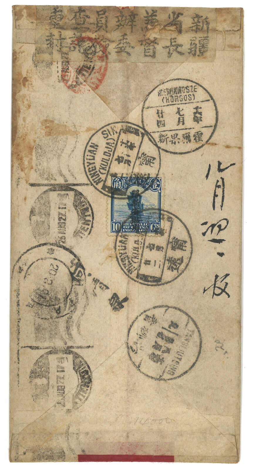 1926.8.5 寧遠經霍爾果斯寄立陶宛,貼帆船加蓋限新省貼用x4,銷寧遠腰框英漢日戳,旁見掛號標籤及檢查封條。8.8經霍爾果斯。9.5抵Kaunas。霍爾果斯於1926年1月17日起成為國際交換局,郵例較塔城少。(Image 1) (Image 2)