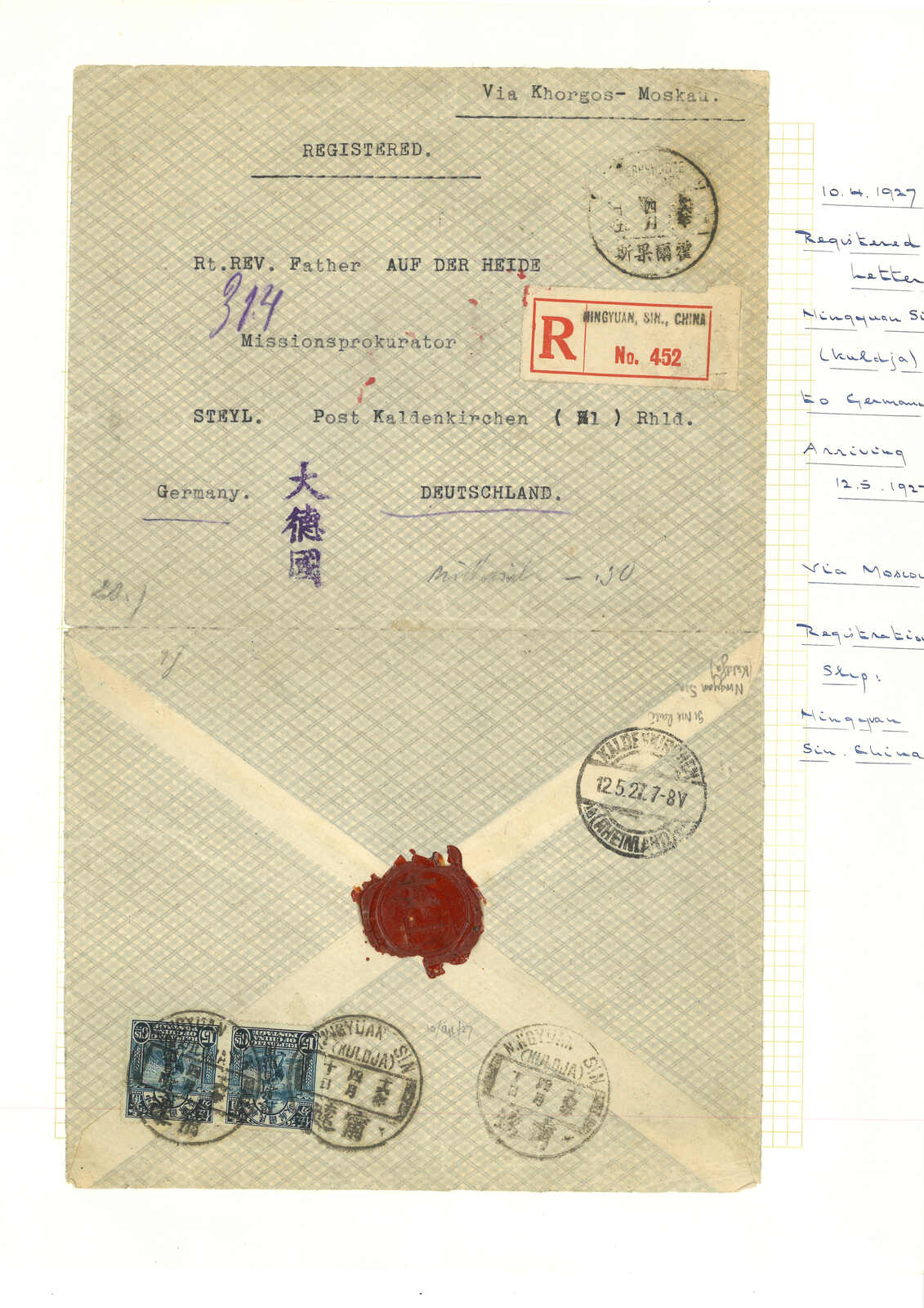 1927.4.10 寧遠經霍爾果斯寄德國,背貼農穫圖加蓋限新省貼用1角5分雙連,銷寧遠腰框英漢日戳。4.15經霍爾果斯,5.12抵Kaldenkirchen。霍爾果斯於1926年1月17日起成為國際交換局,郵例較塔城少。 封剖開以作展示。(Image 1)