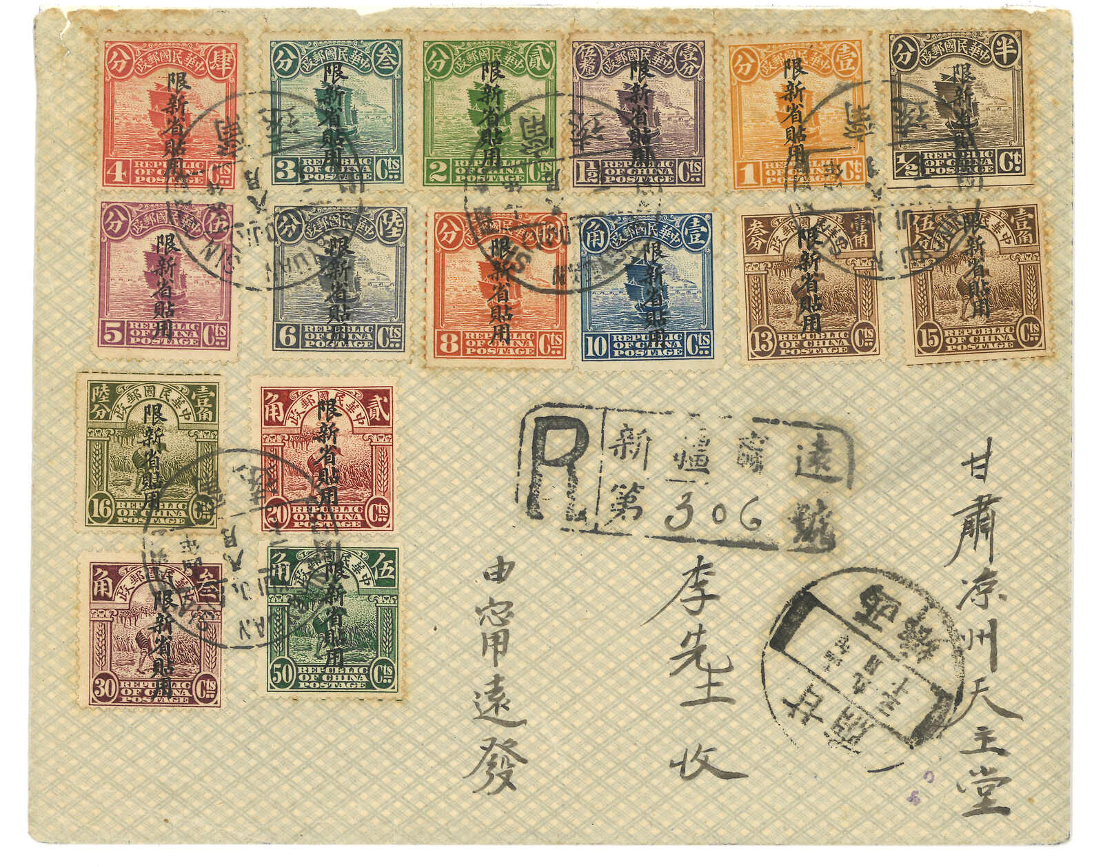 3157 cover image1925 Ningyuan (27 Aug) to Kansu. Registered cover, f.w. Peking 1st Print Junk 2nd ovpt. Limited For Use in Sinkiang x16, from 1/2c to 50c, tied by Ningyuan bilignual cds., along with registered mark. Arrived Sisiang (30 Sep).Appealing colourful franking,
