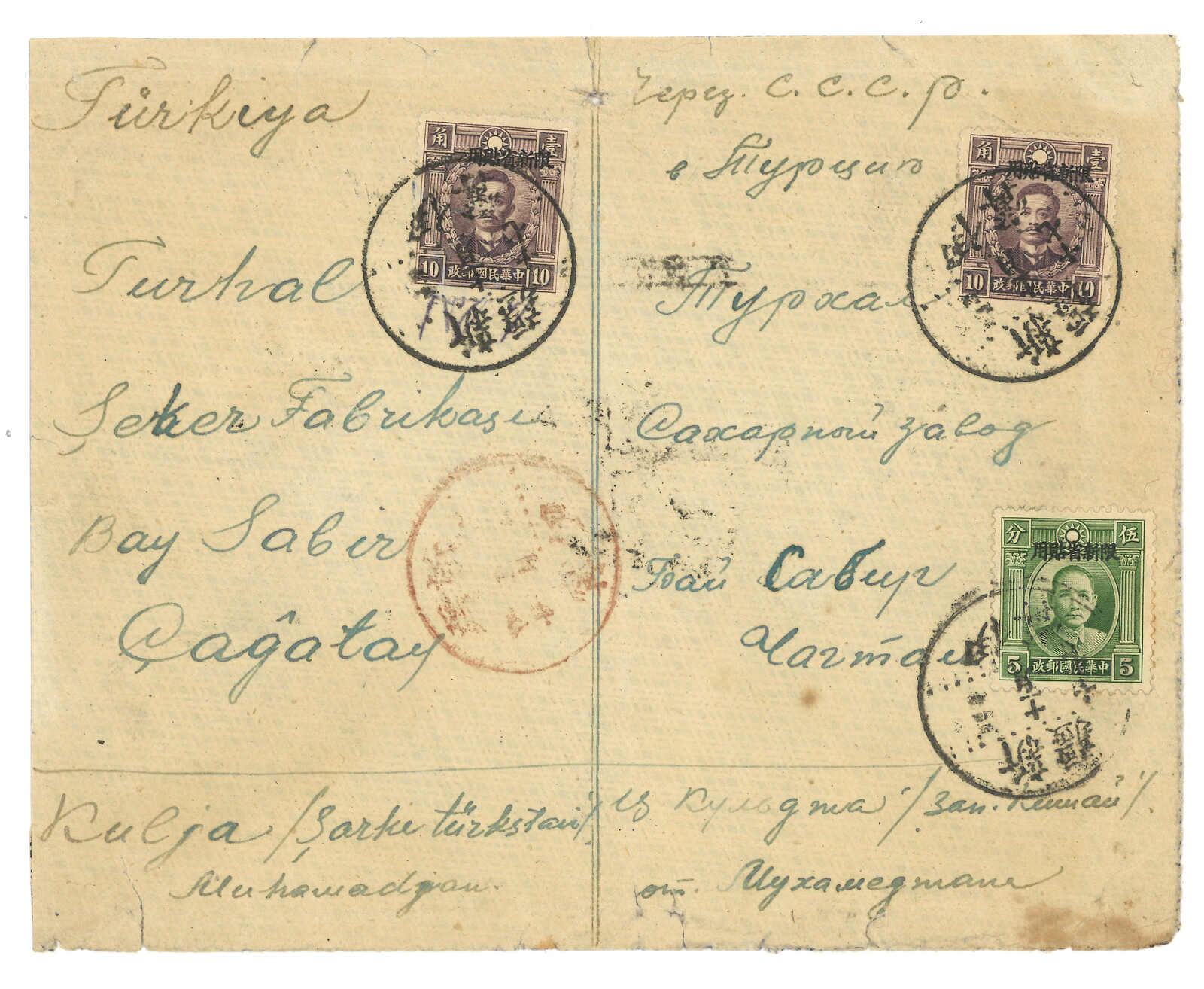 1936.11.17 伊寧經霍爾果斯寄土耳其,貼孫像及烈士加蓋限新省用用5分 + 1角x2,銷新疆伊寧6型三格日戳。11.21經霍爾果斯。12.21抵Turhai。霍爾果斯於1926年1月17日起成為國際交換局,郵例較塔城少。(Image 1) (Image 2)