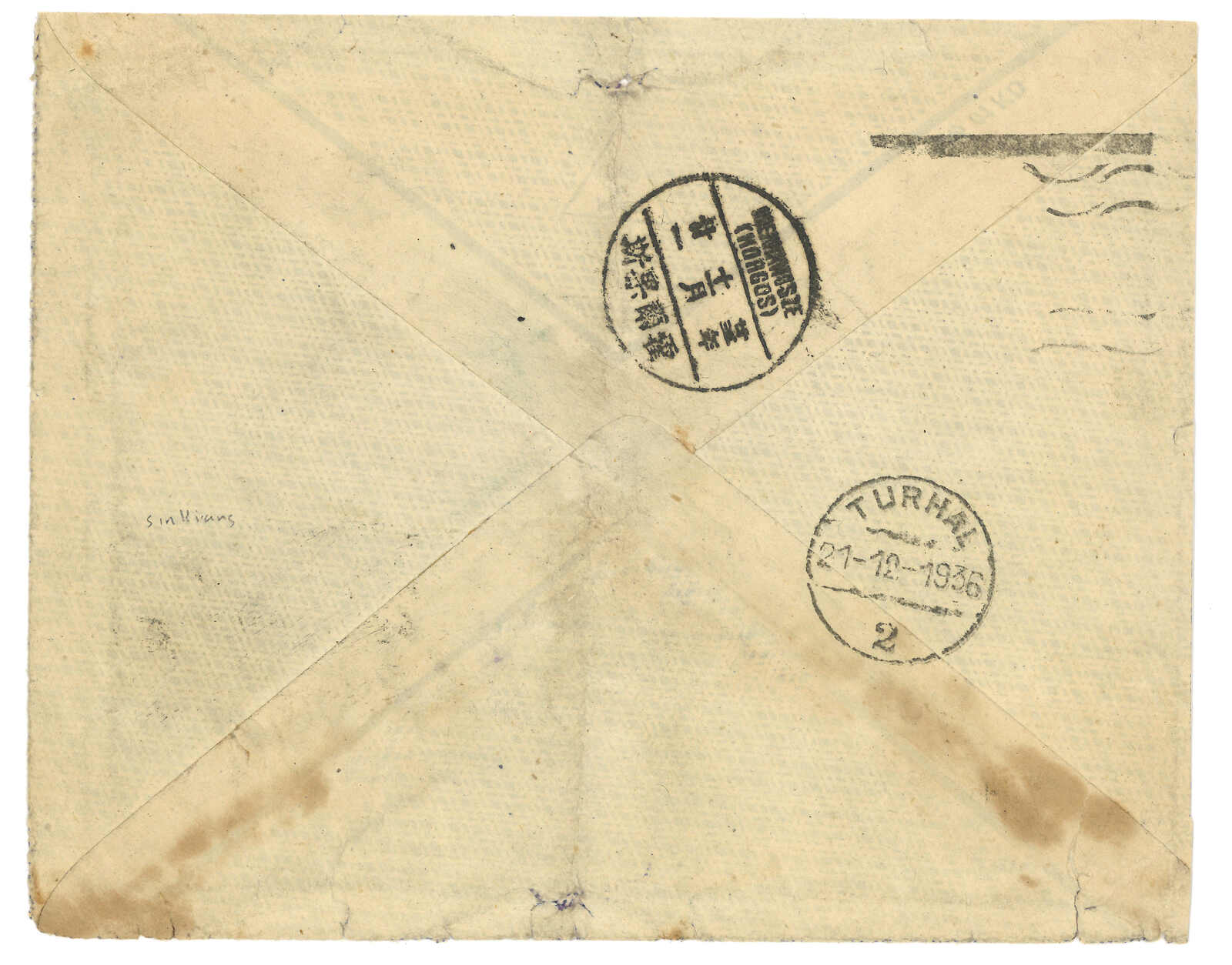 3155 cover image1936 Kuldja (17 Nov) to Turkey, f.w. SYS and Martyrs ovpt. Limited For Use in Sinkiang 5c + 10c x2, tied by Sinkiang Kuldja type 6 cds. Transit Hoerhkwosze (21 Nov). Arrived Turhai (21 Dec). Hoerhkwosze functioned as international exchange office since 17 Jan 1926. However, mails were much fewer than Tacheng.
