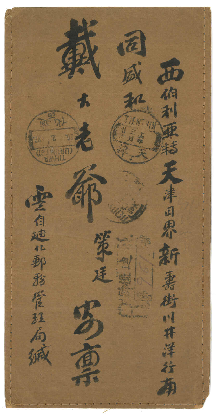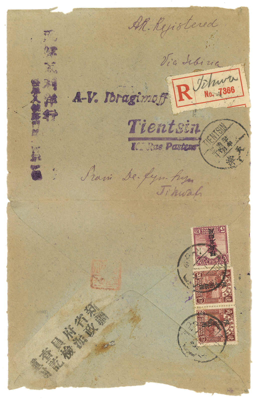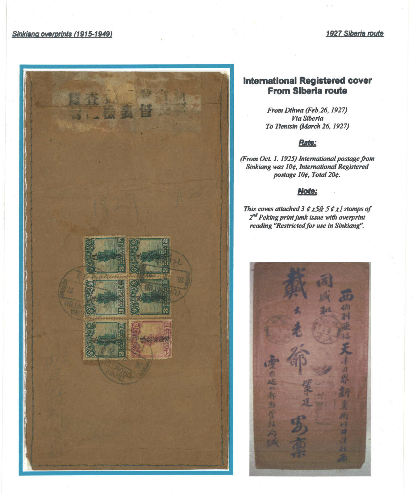 3147 cover image1927 Tihwa (26 Feb) to Tientsin via Siberia, f.w. Junk ovpt. Limited For Use in Sinkiang 3c x5 + 5c in total of international registered letter rate 20c, tied by Tihwa bilingunal cds. Censored and resealed. Arrived Tientsin (26 Mar).