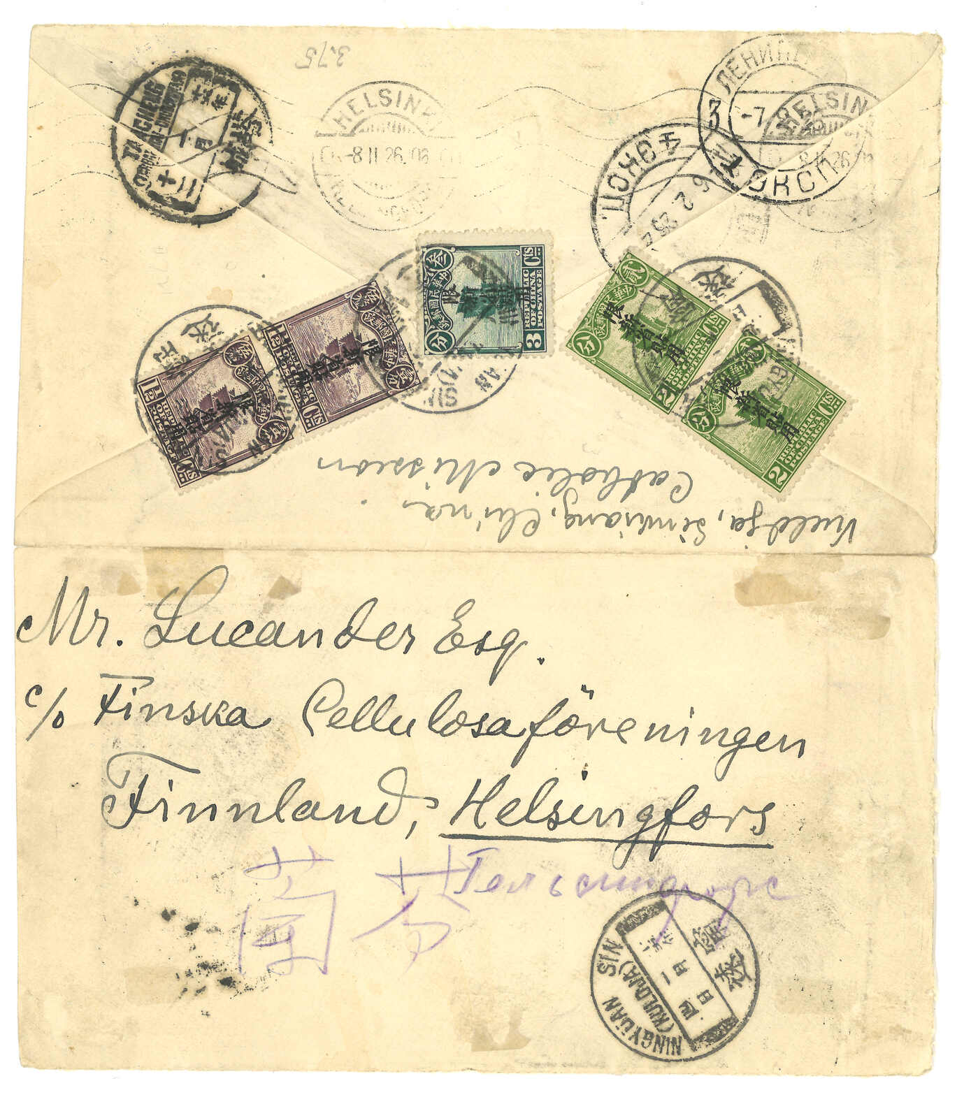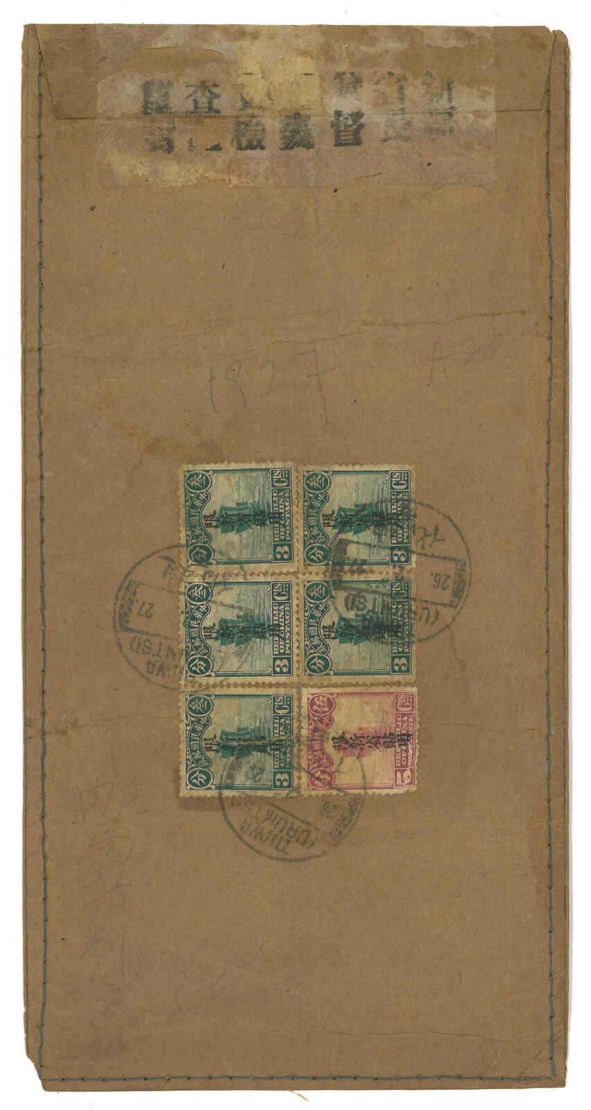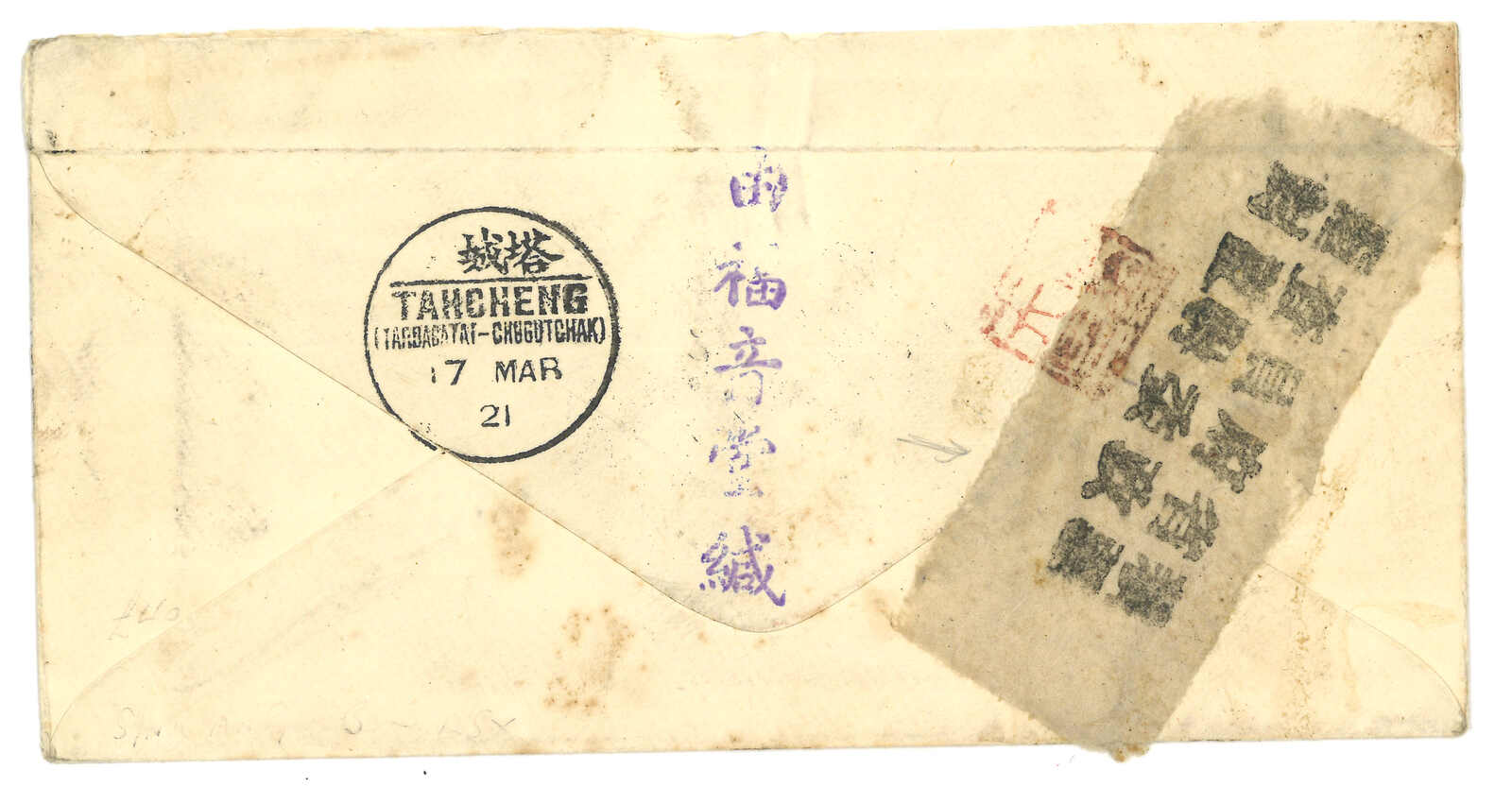 3154 cover image1927 Ningyuan (22 Jul) o Tientsin via Hoerhkwosze, f.w. Junk ovpt. Limited For Use in Sinkiang 10c on reverse, tied by Ningyuan bilingual cds, alongside with type 4 censor label. Transit Hoerhkwosze (24 Jul), Chita (20 Aug), Tientsin (23 Aug). Arrived Yangliutsing. Hoerhkwosze functioned as international exchange office since 17 Jan 1926. However, mails were much fewer than Tacheng.