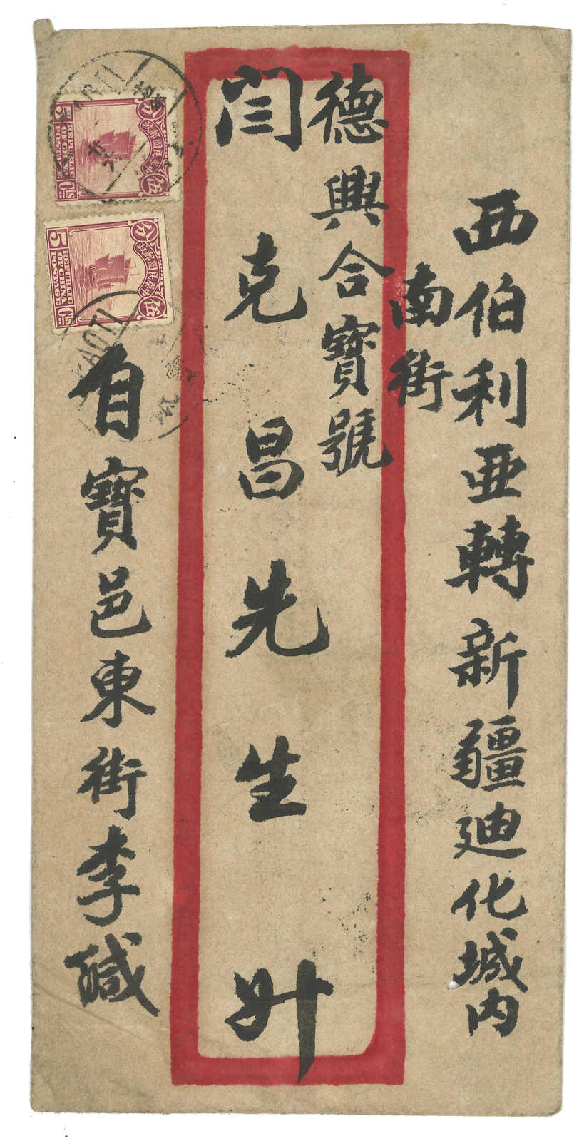 1931年迪化經西伯利亞寄天津。雙掛號封,背貼帆船加蓋限新省貼用5分 + 2角雙連,銷迪化腰框英漢日戳,旁見掛號標籤。4.20抵天津。封剖開以作展示。(Image 1)