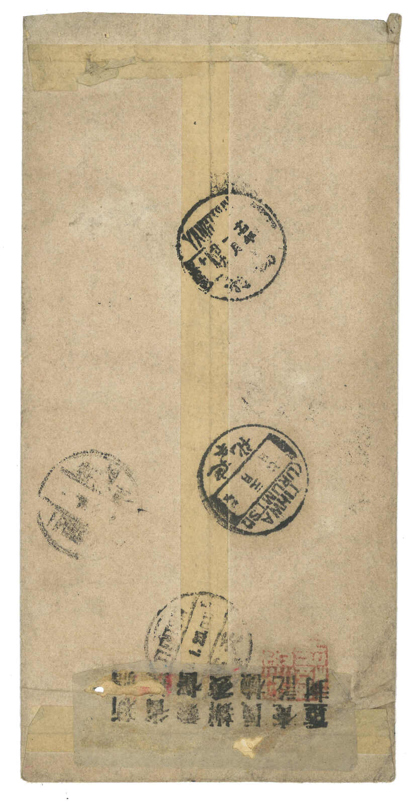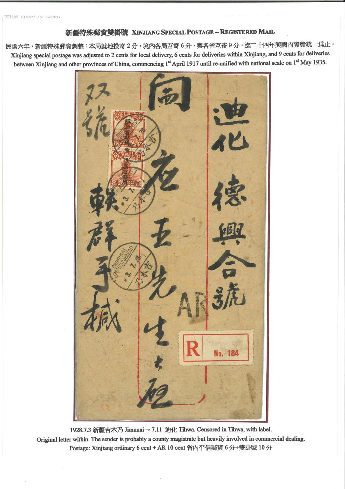 3151 cover image1931 Tihwa to Tientsin via Siberia. Double-registered cover, f.w. Junk ovpt. Limited For Use in Sinkiang 5c + 20c in pair, tied by Tihwa bilingual cds, along with registered label. Arrived Tientsin (20 Apr). Cover opened out for display.