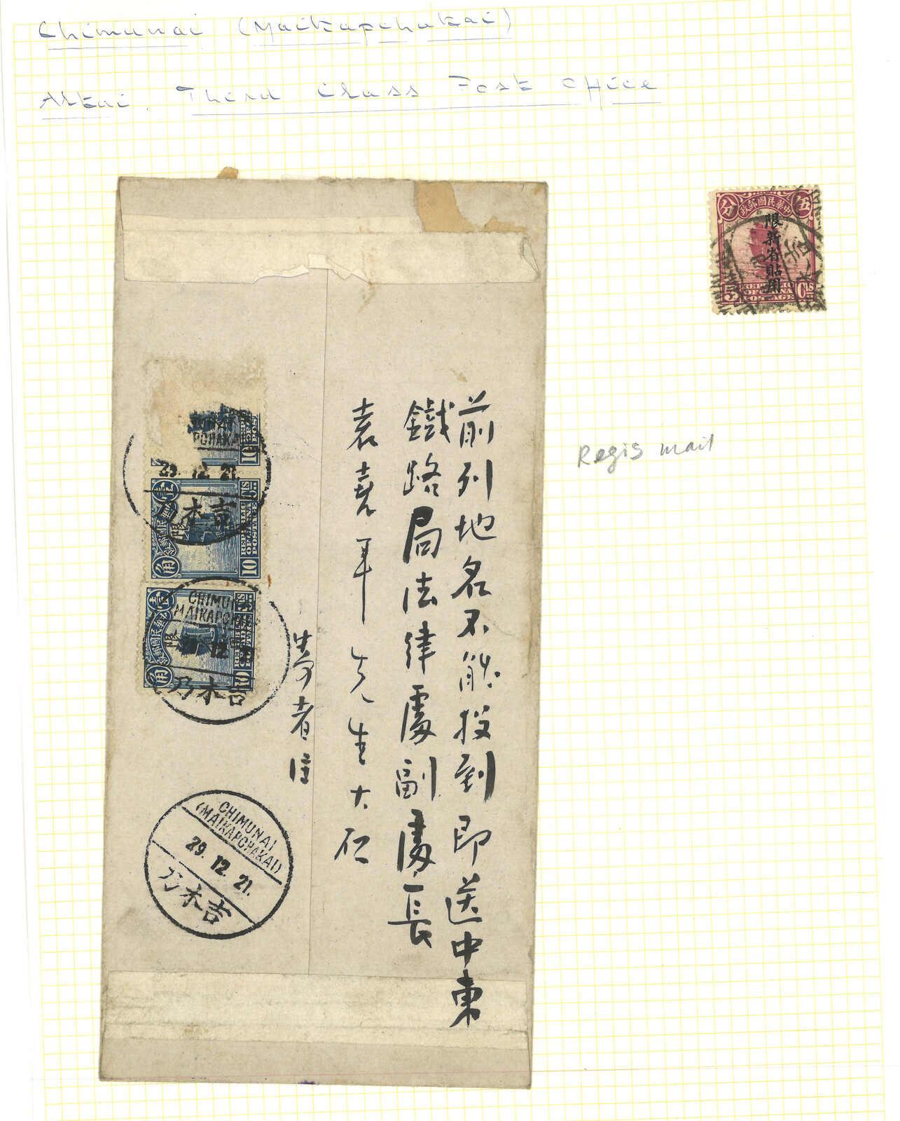 3145 cover image1921 and 1928 a pair of domestic covers from Chimunai, both f.w. Junk ovpt. Limited For Use in Sinkiang issues. One addressing to Tihwa and f.w. 16c for intra-Sinkiang double registered rate while another one f.w. 30c for international rate to Harbin via Siberia.