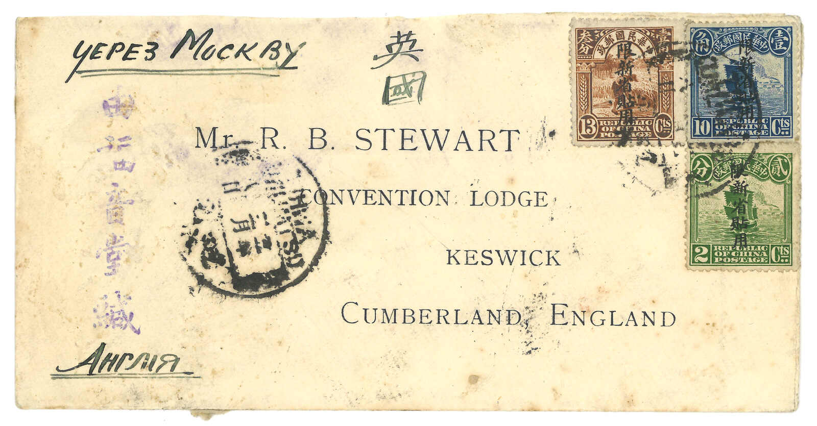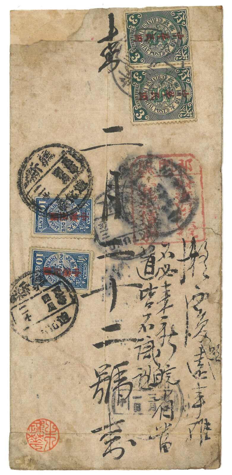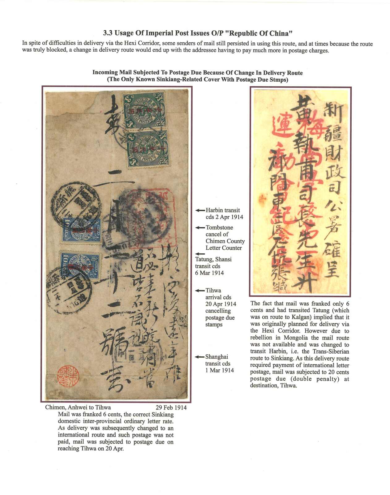 3144 cover image1914 Chumun to Tihwa. Taxed cover, applied with Chumunhsien mail box tombstone cancel on reverse. F.w. Coiling Dragon London ovpt. ROC 3c in pair, tied by Anhwei cds. Transit Shanghai (1 Mar), Tatung (6 Mar), Harbin (2 Apr), Arrived Tihwa (20 Apr) with postage due ovpt. ROC 10c x2. Given the Tatung transit cds, this cover was supposed to be sent via Hosi Corridor. But due to the unrest in Mongolia, the was delivered via Siberia to Sinkiang instead which required international postage. Therefore, postage due was levied. It is the only recorded Sinkiang cover with postage due stamp.