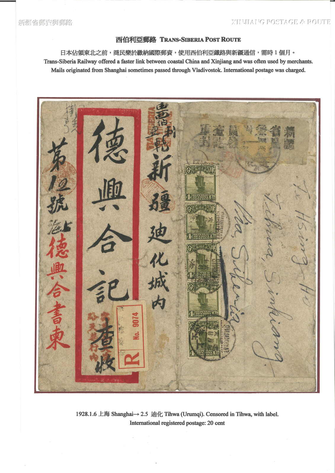 3148 cover image1928 Shanghai (6 Jan) to Tihwa via Siberia, f.w. Junk 4c in strip of 5 for international registered rate, tied by Shanghai bilingual cds, along with registered and censor label. Arrived TIhwa (5 Feb). Cover opened out for display.
