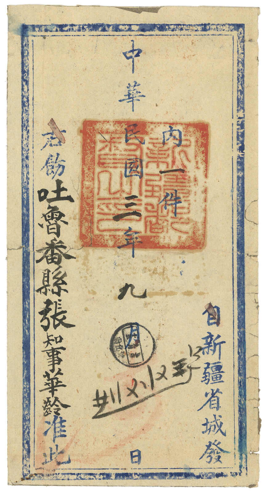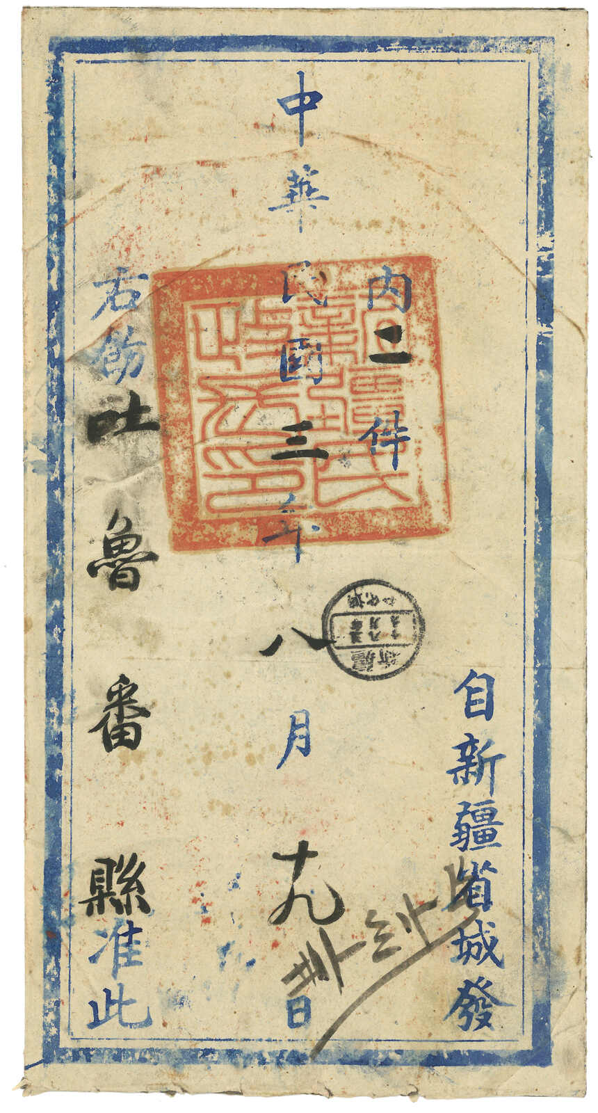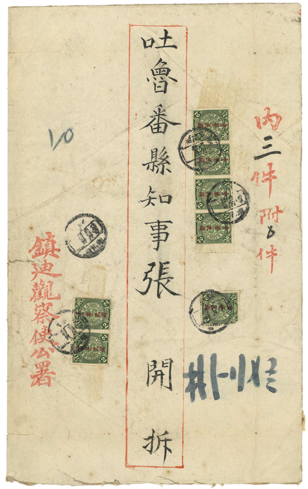 1914.8. 迪化寄吐魯番。大型公文封,寫有“內三件”,貼楷字蟠龍2分7枚,合1角4分三倍重量新疆省內掛號郵資,銷迪化府腰框日戳。8.22抵吐魯番。民國蟠龍票於1914年3月已頒令停用,但在新疆則一直使用至1915年5月。(Image 1) (Image 2)