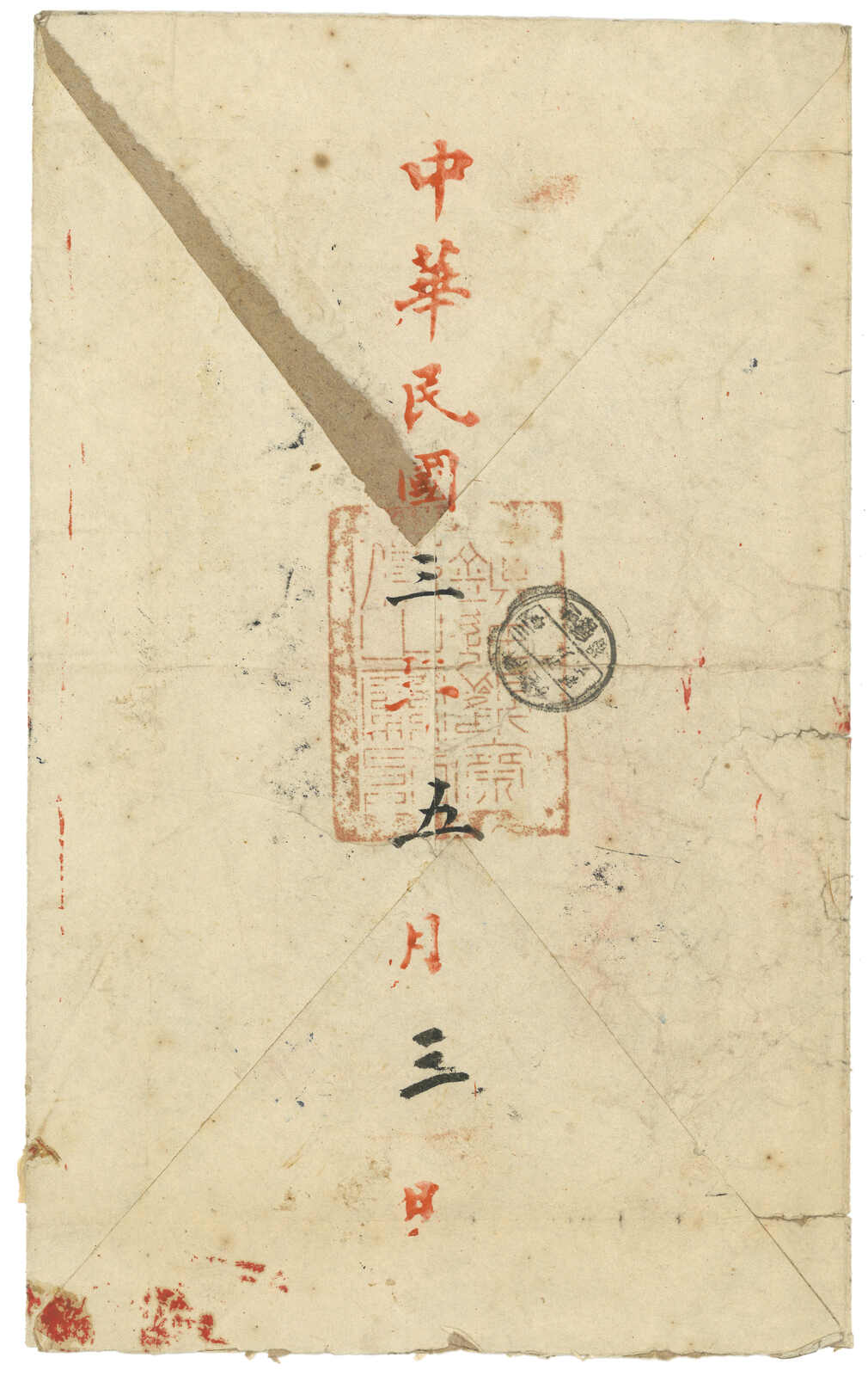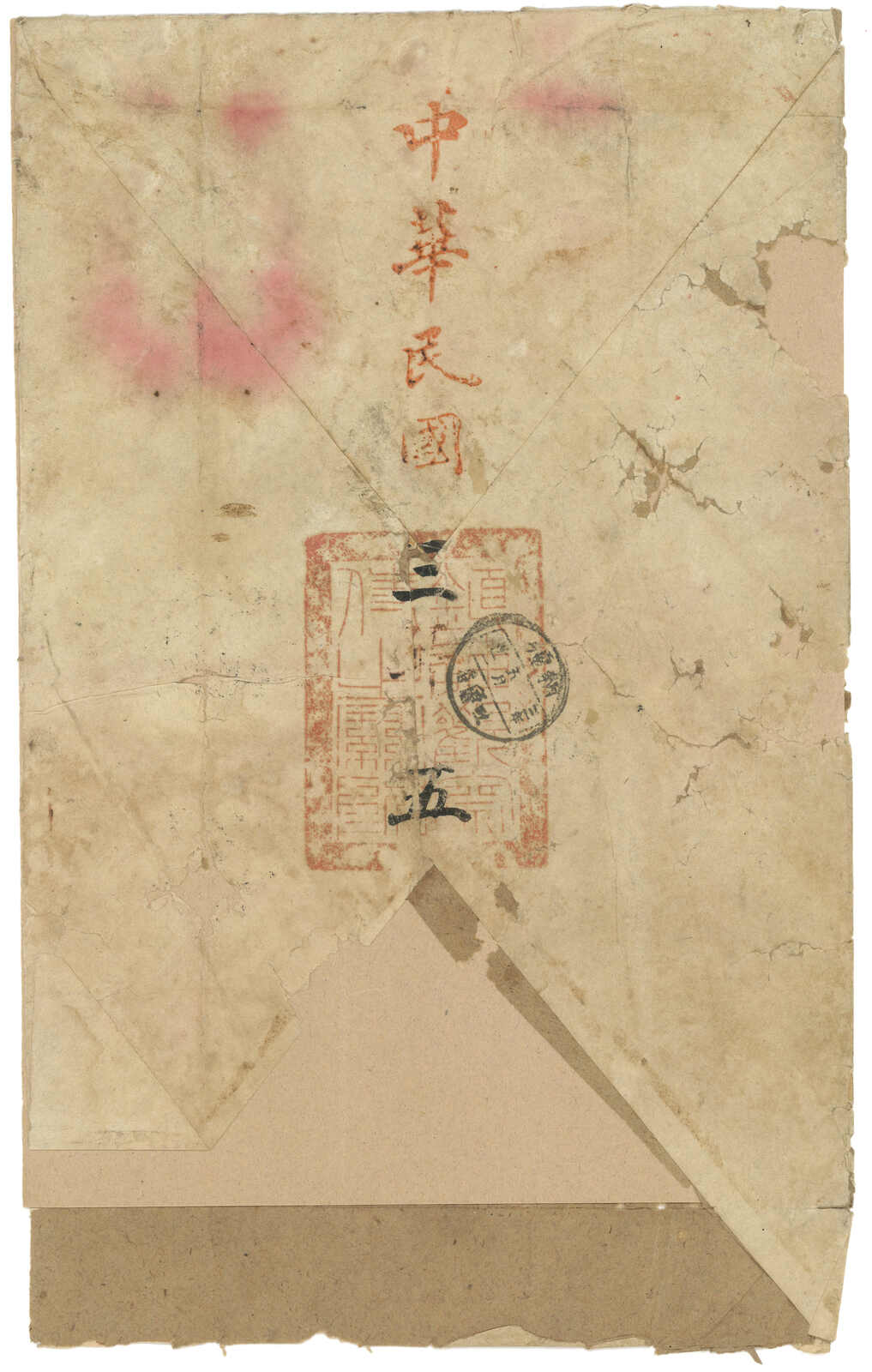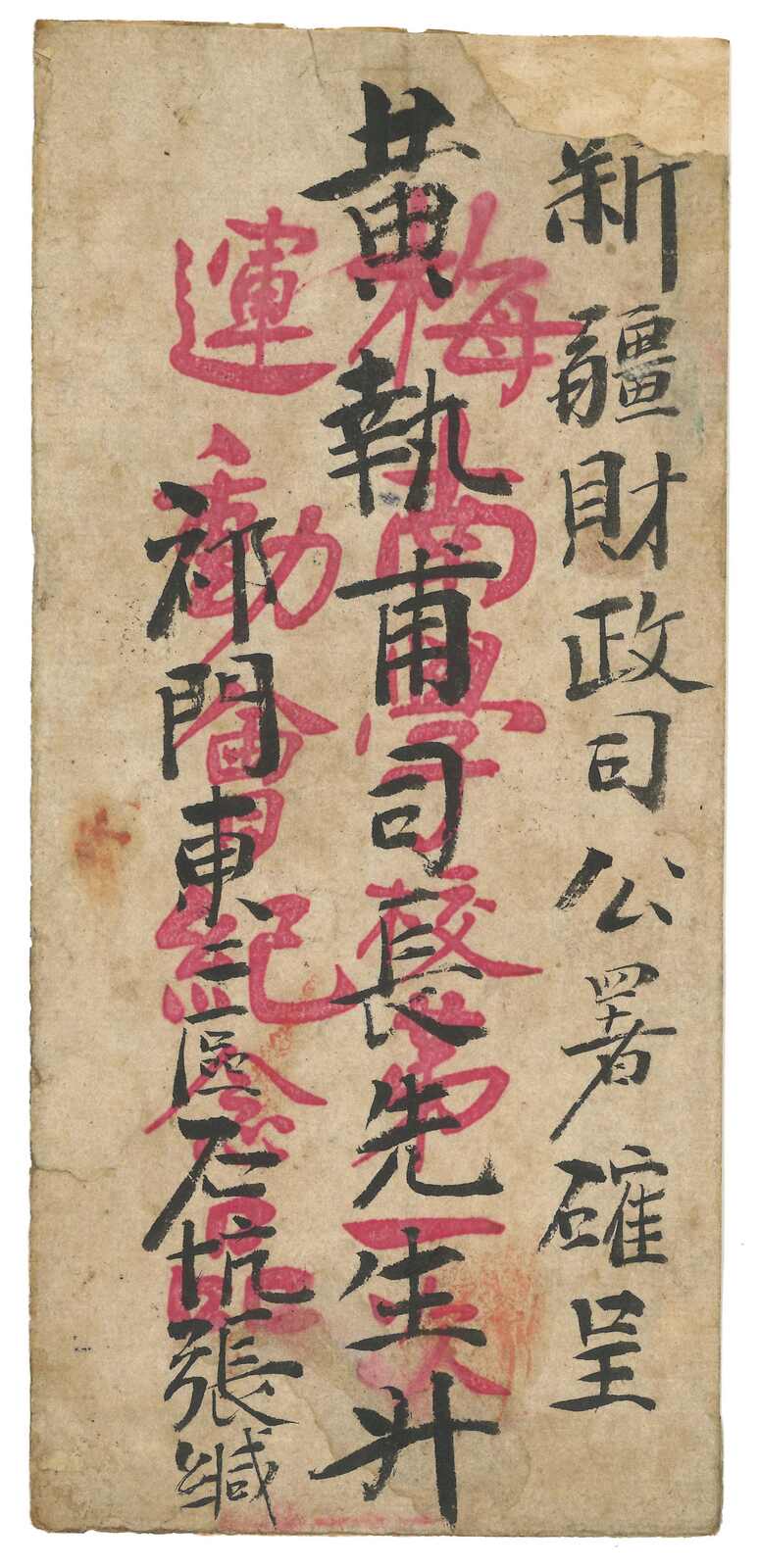 1914.5.9 迪化寄吐魯番。大型公文封,寫有“內五件”,貼楷字蟠龍2分雙連 + 宋字蟠龍5分雙連,合1角4分三倍重量新疆省內掛號郵資,銷新疆迪化腰框日戳。12.12抵吐魯番。封背有損,部分分離。(Image 1) (Image 2) (Image 3)