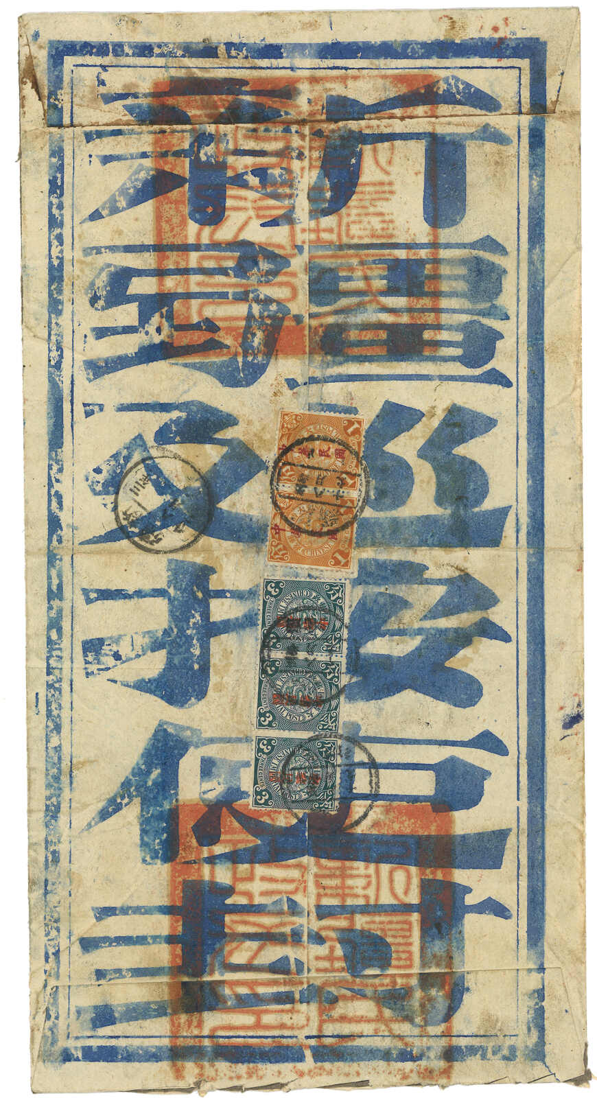 3140 cover image1914 Tihwa (19 Aug) to Turfan. Large official cover, stated containing 2 letters, f.w. Coiling Dragon London ovpt. ROC 1c in pair + Statistical Dept ovpt. 3c in strip of 3, in total of 11c double weight registered intra-Sinkiang letter rate, tied by Sinkiang Tihwa cds. Coiling Dragon ovpt. ROC issues were ordered to be withdrawn from usage in Mar 1914 but they were still in use in Sinkiang until May 1915.