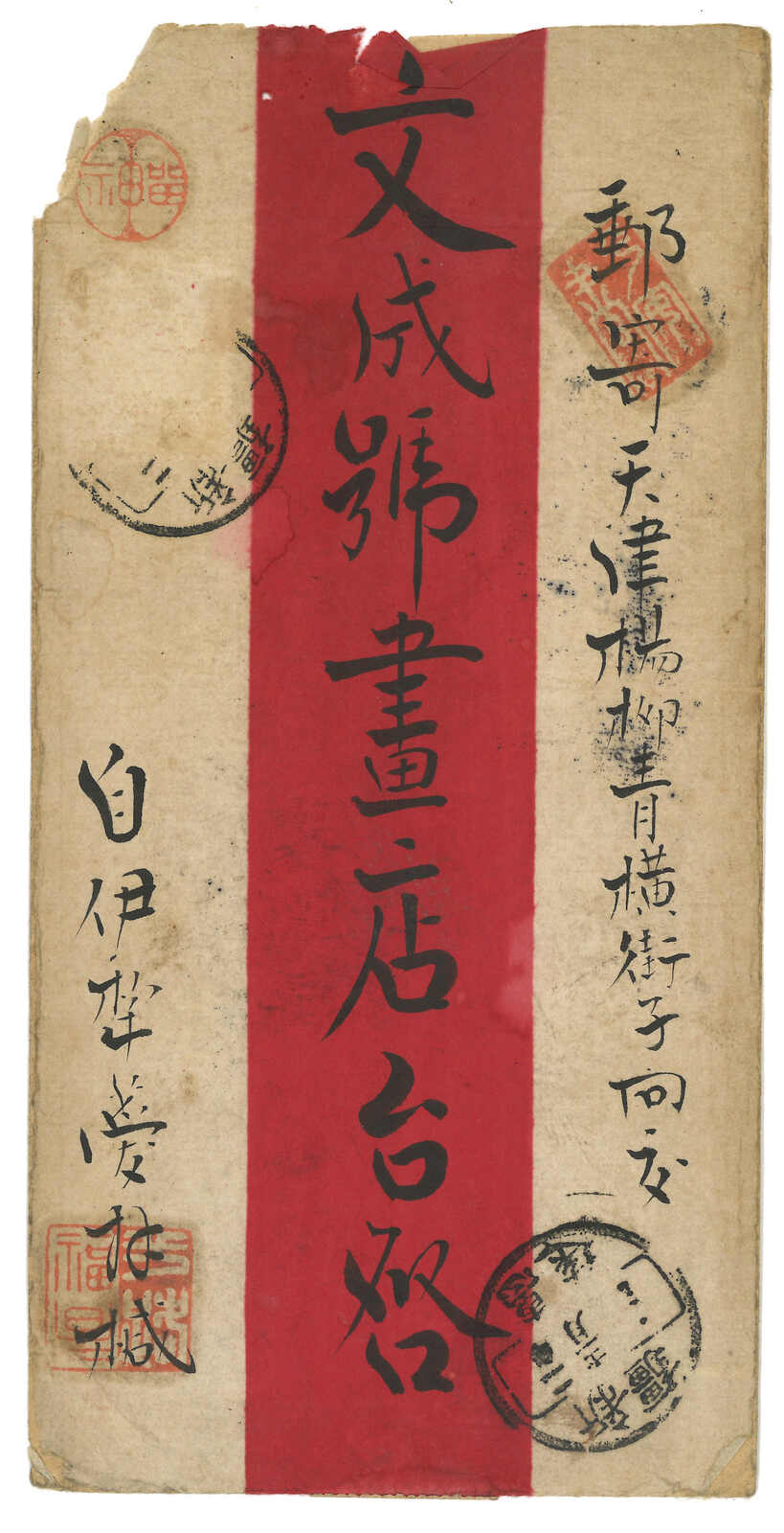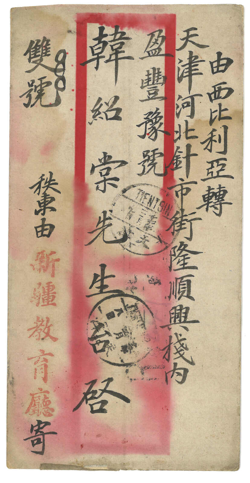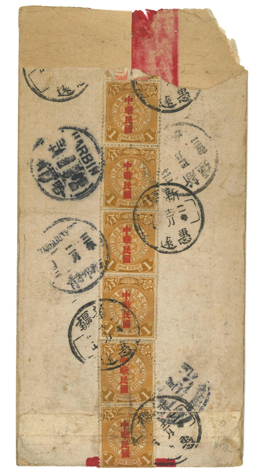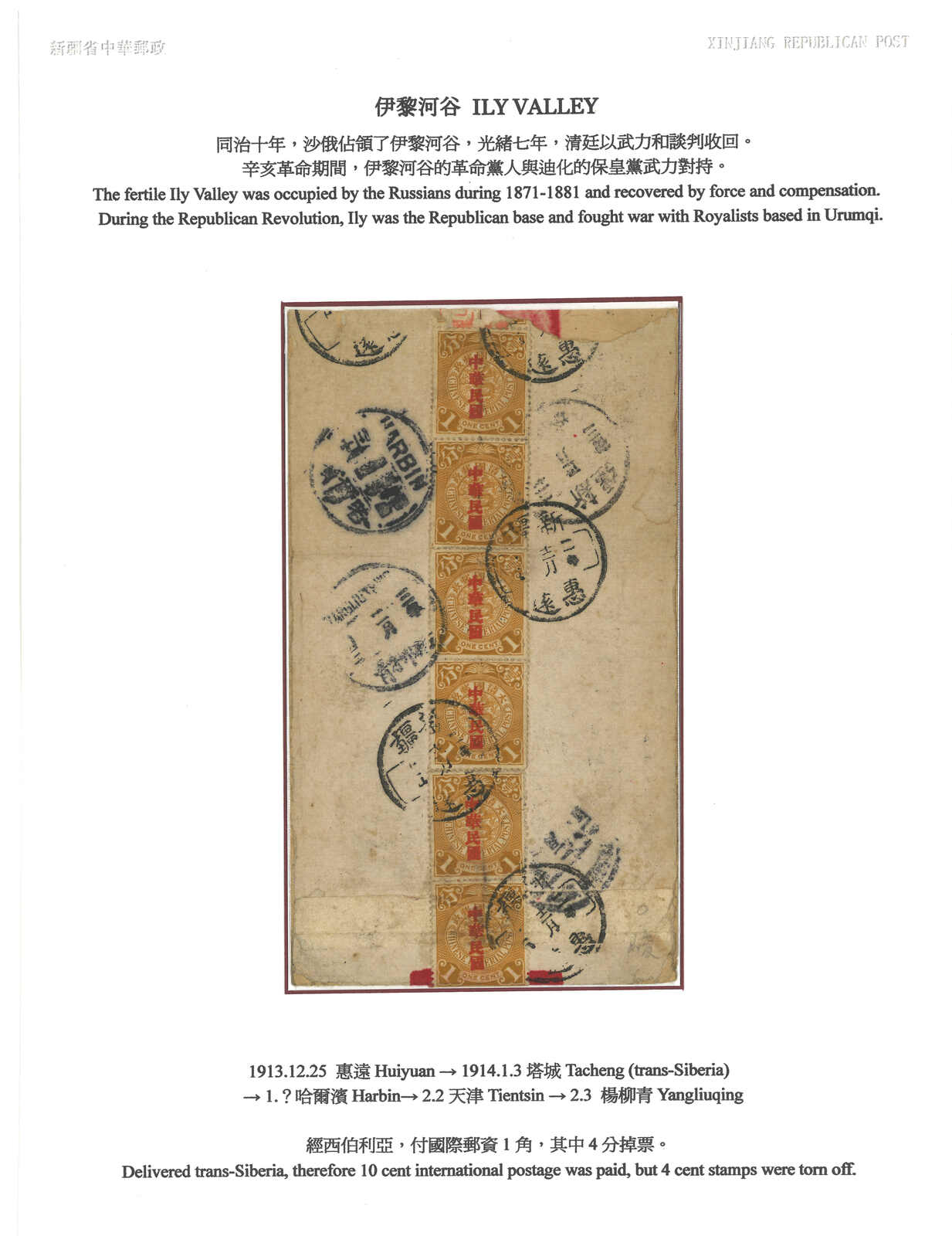 1913.12.25 惠遠經西伯利亞寄天津。紅條封,背貼宋字蟠龍1分直六連 + 應有一枚4分掉票,銷新疆惠遠腰框日戳。1.3經塔城,1月經哈爾濱,2.2經天津。2.3抵楊柳青。(Image 1) (Image 2) (Image 3)