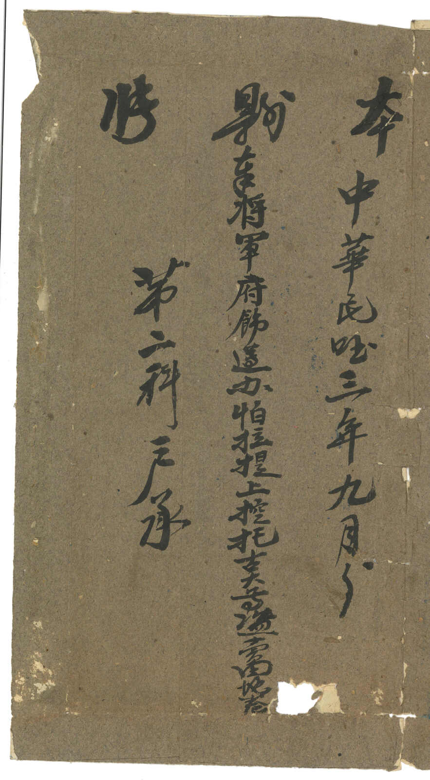1914.9.15 迪化寄吐魯番。大型公文封,貼楷字蟠龍1分雙連 + 楷字蟠龍3分雙連,合1角1分雙倍重量新疆省內掛號郵資,銷新疆迪化腰框日戳。9.17抵吐魯番。此封未見AR章,未知有否與其他相似例子般,貼付單掛號郵資而享有公文雙掛號待遇。封帶裂口。(Image 1) (Image 2) (Image 3)