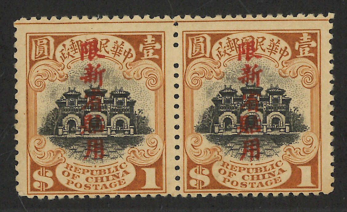 1915年北京一版宮門第一次加蓋(歪頭)“限新省貼用”1元橫雙連新(陳目PS16),無貼上品(Image 1) (Image 2)