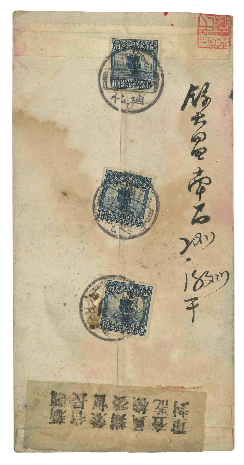 3139 cover image1914 Tihwa (4 May) to Turfan. Large official cover, stated containing 3 letters, f.w. Coiling Dragon London ovpt. ROC 2c x7, in total of 14c triple weight intra-Sinkiang registered rate, tied by Sinkiang Tihwa cds. Arrived Turfan (6 May). Coiling Dragon ovpt. ROC issues were ordered to be withdrawn from usage in Mar 1914 but they were still in use in Sinkiang until May 1915.