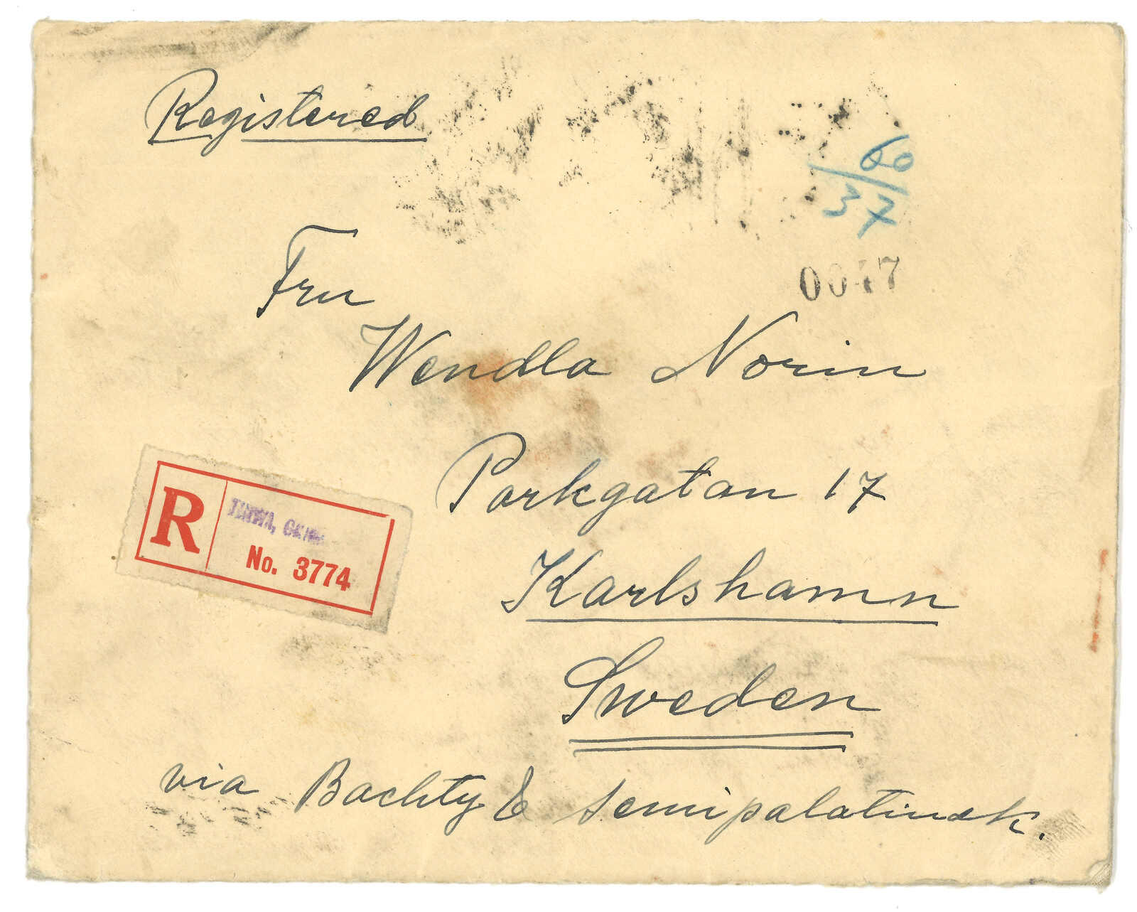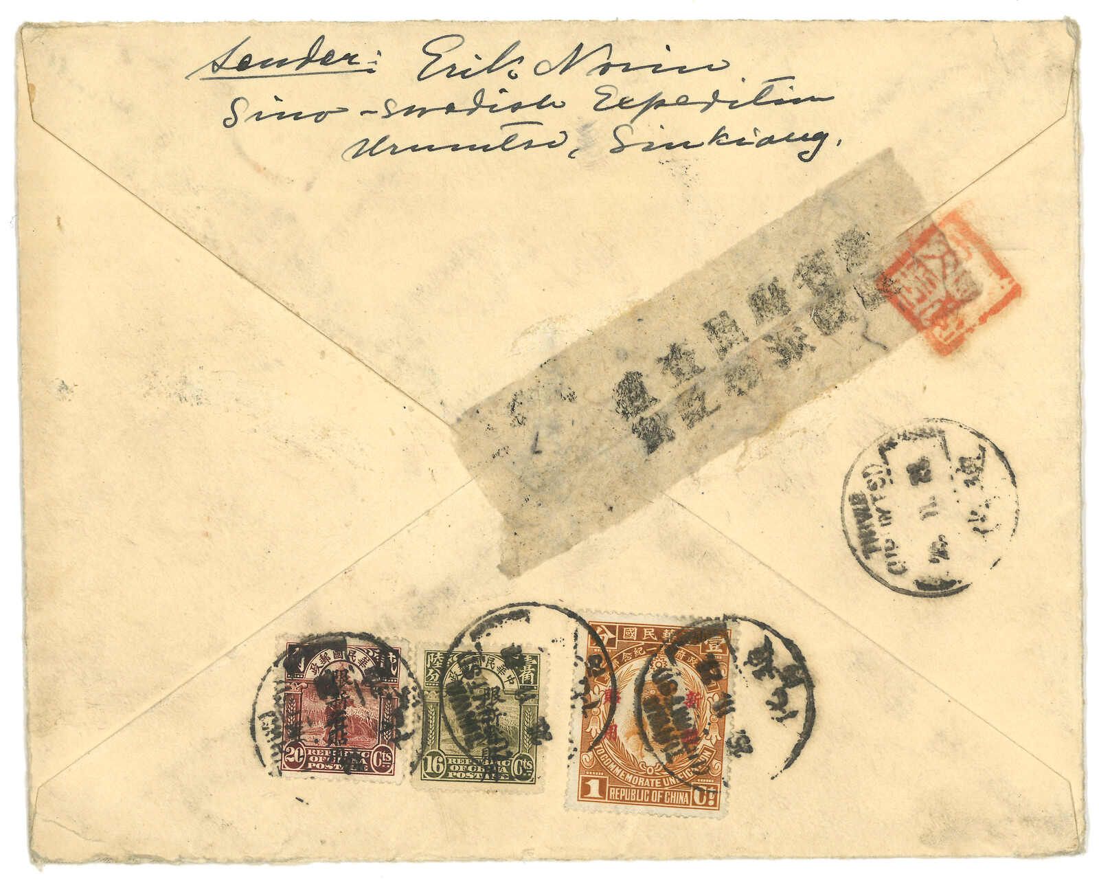 3185 cover image1934 Erik Norin, Tihwa (26 Nov) to Sweden via Russia. Registered cover, f.w. Unification and Junk Use in Sinkiang x3, in total of $1.36, tied by Tihwa cds, alongside with Sinkiang censor label. Norin was a geologist in Hedin's expedition.