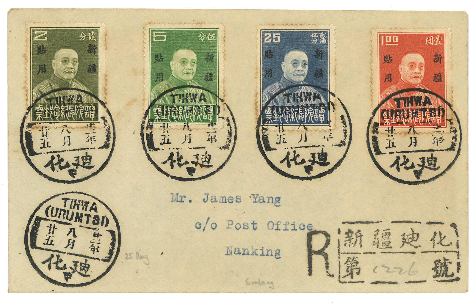 3186 cover image1933 Tihwa (25 Aug) to Nanking. Double-registered cover, f.w. Tan Yen-kai ovpt For Use in Sinkiang complete set (Chan PS113-116), tied by Tihwa bilingual cds., alongside with registered mark. Arrived Nanking (15 Nov).