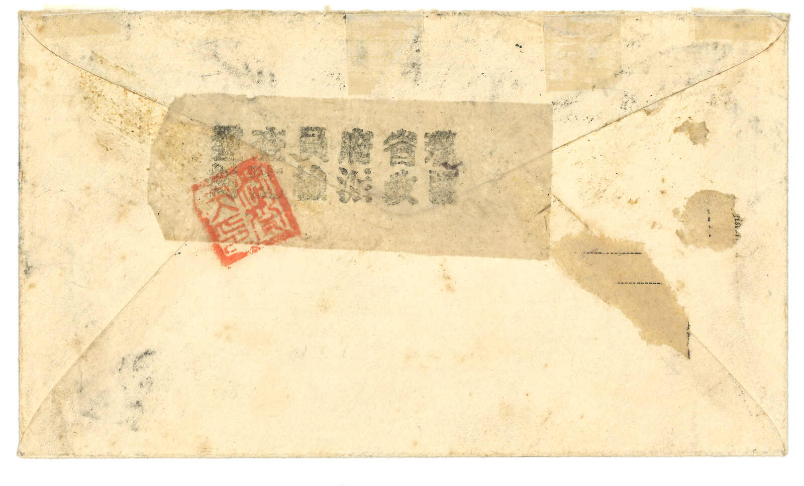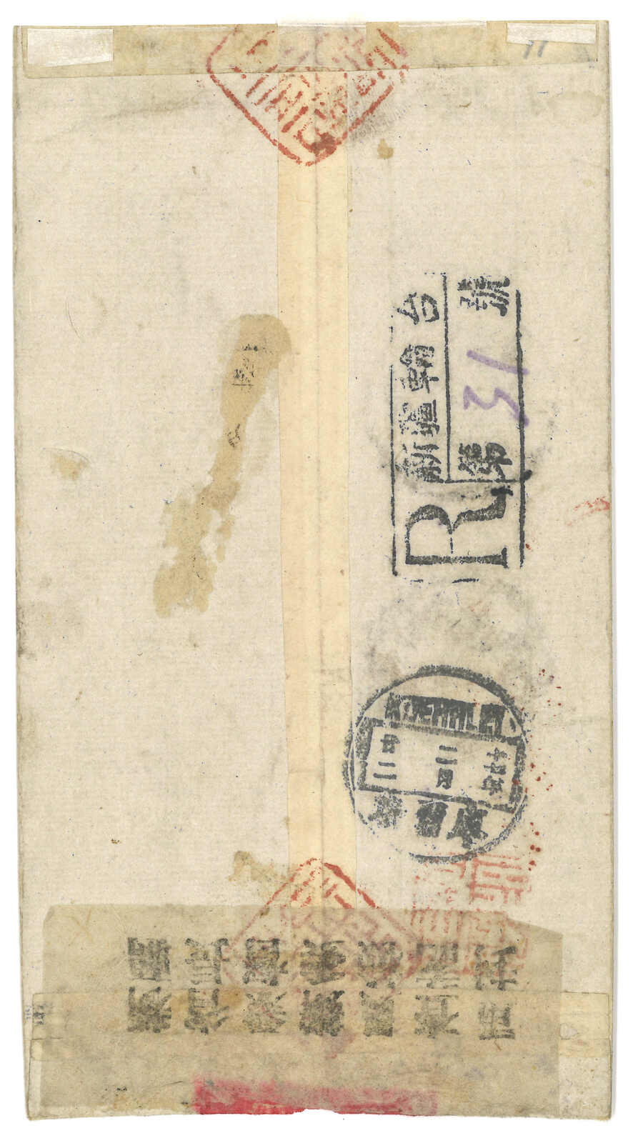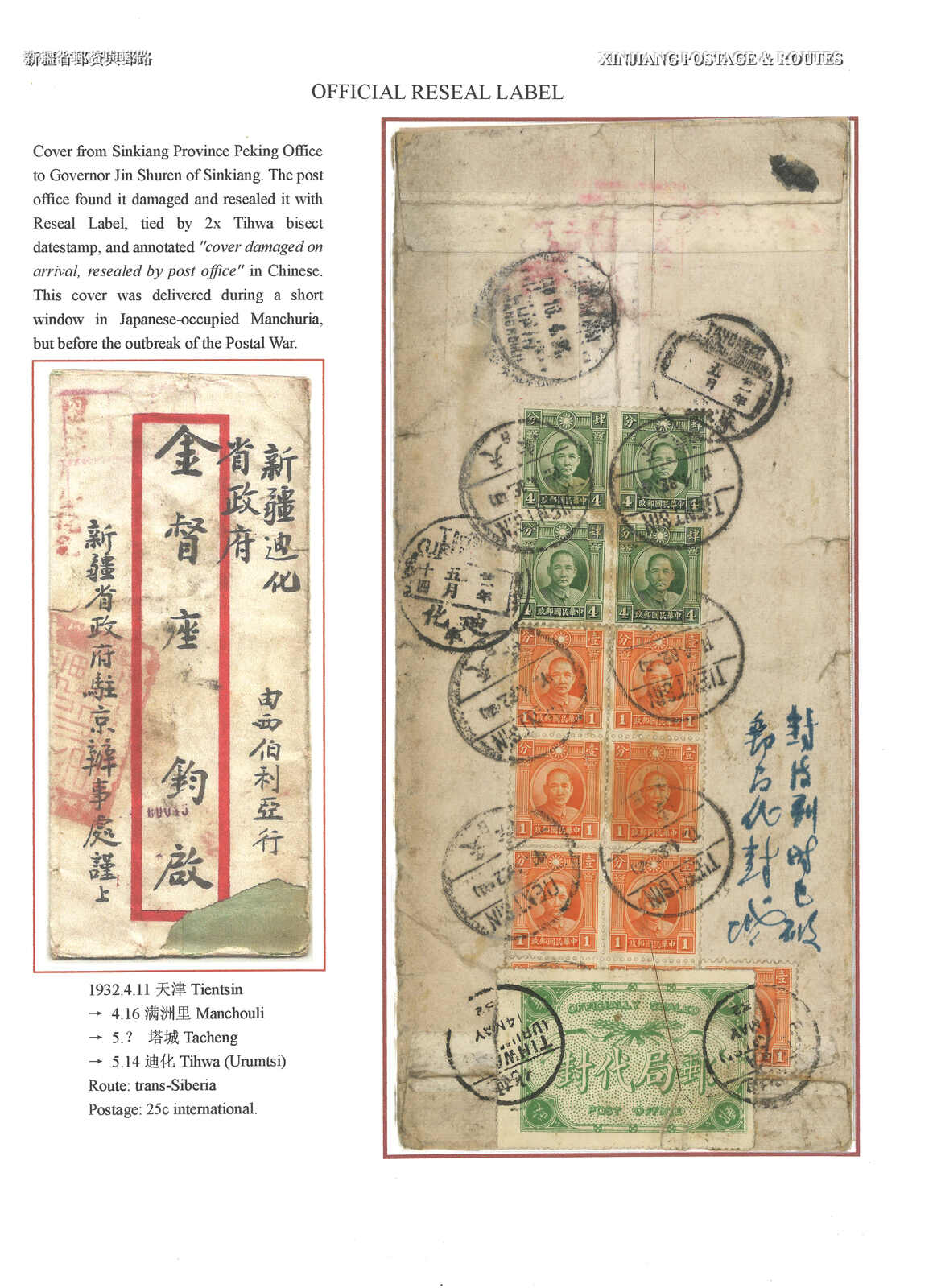 3195 cover image1932 Tientsin (11 Apr) to Jin Shuren, Governor or Sinkiang, Tihwa, f.w. SYS 4c in block of 4 + 1c in block of 9 on reverse, tied by Tientsin bilingual cds. Transit Manchouli (16 Apr), Tacheng (May). Arrived TIhwa (14 May). Showing annotation "Cover damaged upon arrival, resealed by post office" and repaired with 6th print reseal label. Very scarce usage of reseal label in Sinkiang.