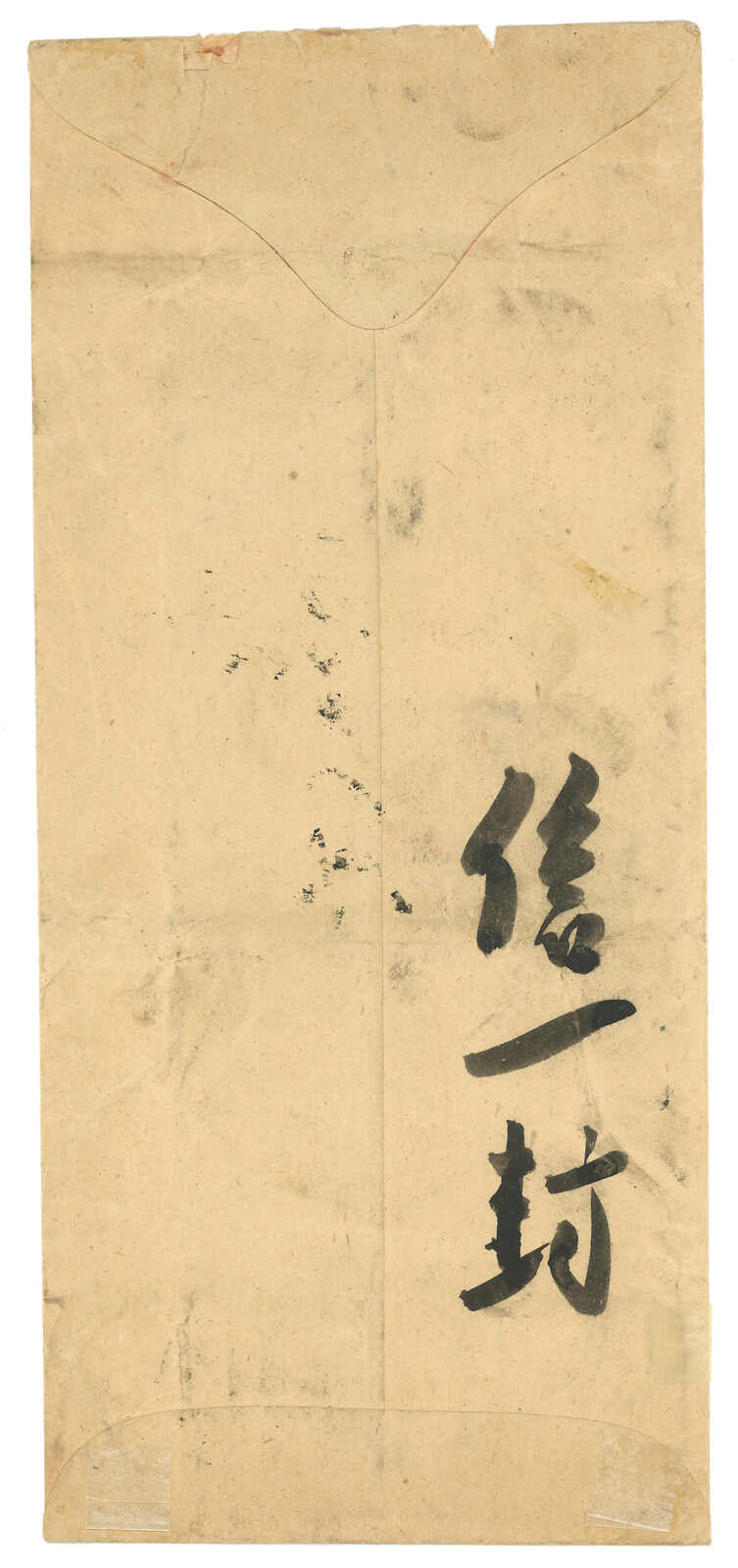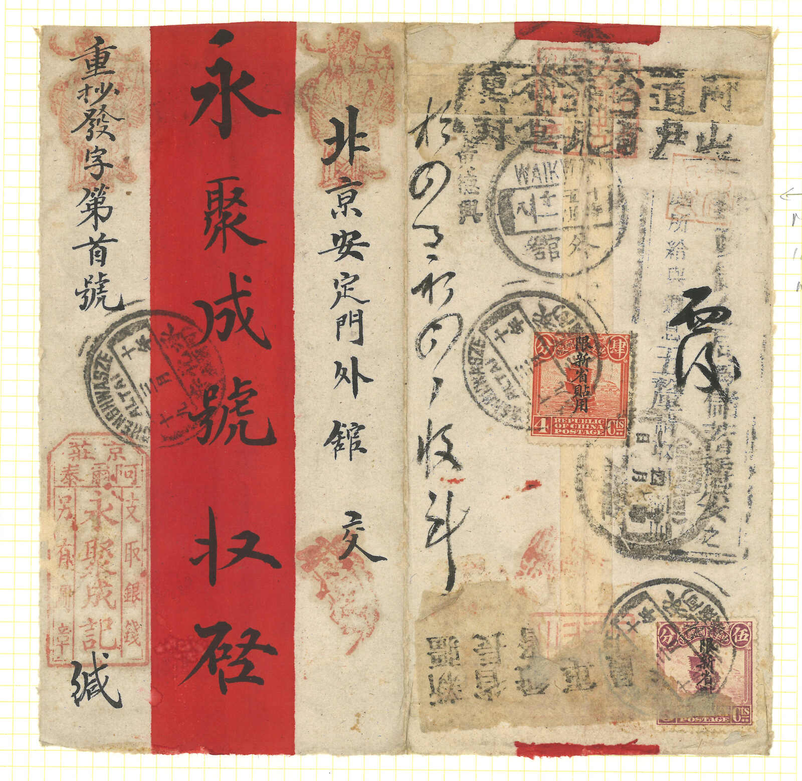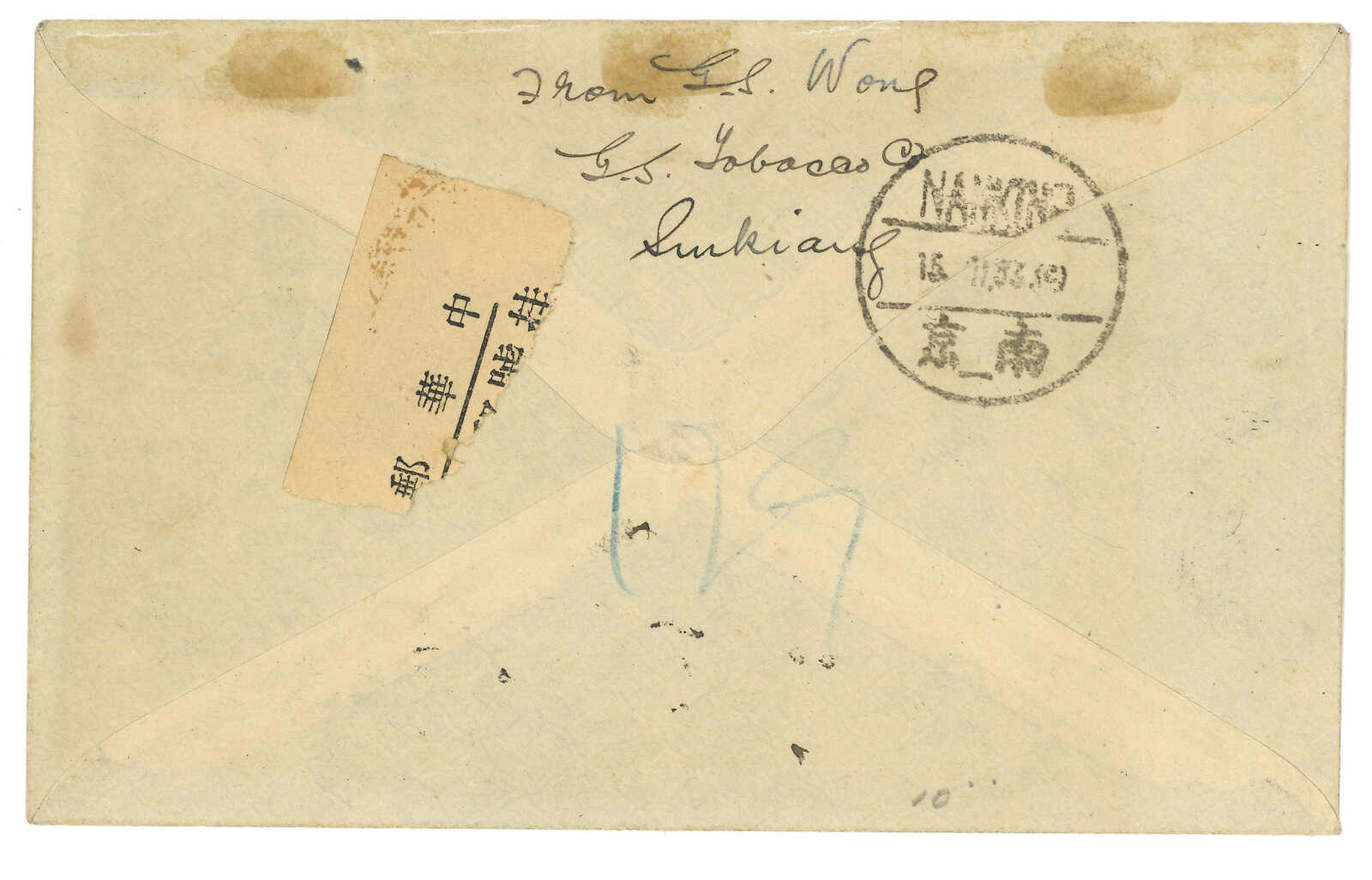 3195 cover image1932 Tientsin (11 Apr) to Jin Shuren, Governor or Sinkiang, Tihwa, f.w. SYS 4c in block of 4 + 1c in block of 9 on reverse, tied by Tientsin bilingual cds. Transit Manchouli (16 Apr), Tacheng (May). Arrived TIhwa (14 May). Showing annotation "Cover damaged upon arrival, resealed by post office" and repaired with 6th print reseal label. Very scarce usage of reseal label in Sinkiang.