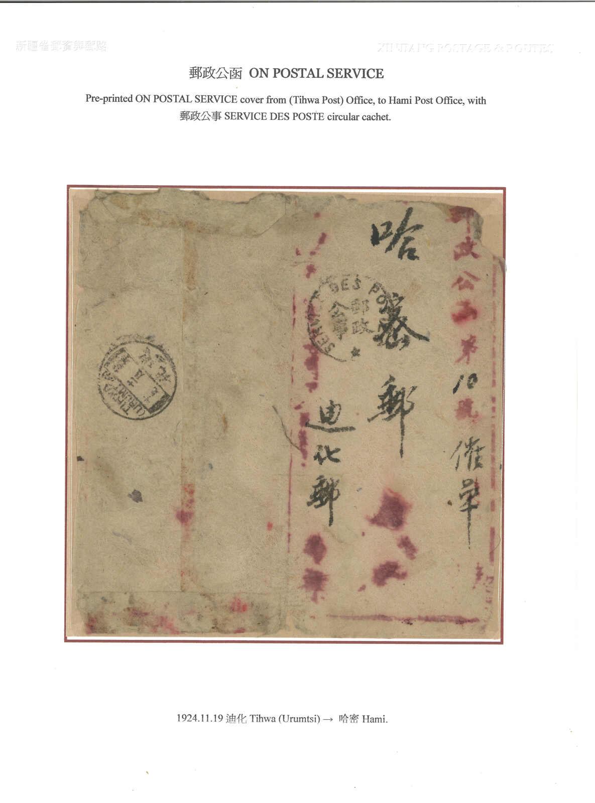 1924.11.19 迪化寄哈密,無貼票,鈐“郵政公事”中文法文圓戳及迪化始發日戳。封剖開以作展示。郵政公事戳見於新疆郵件上甚為難得。(Image 1)