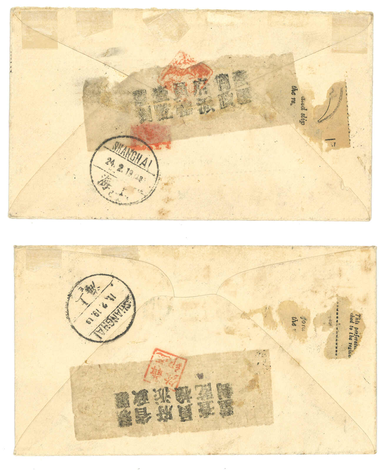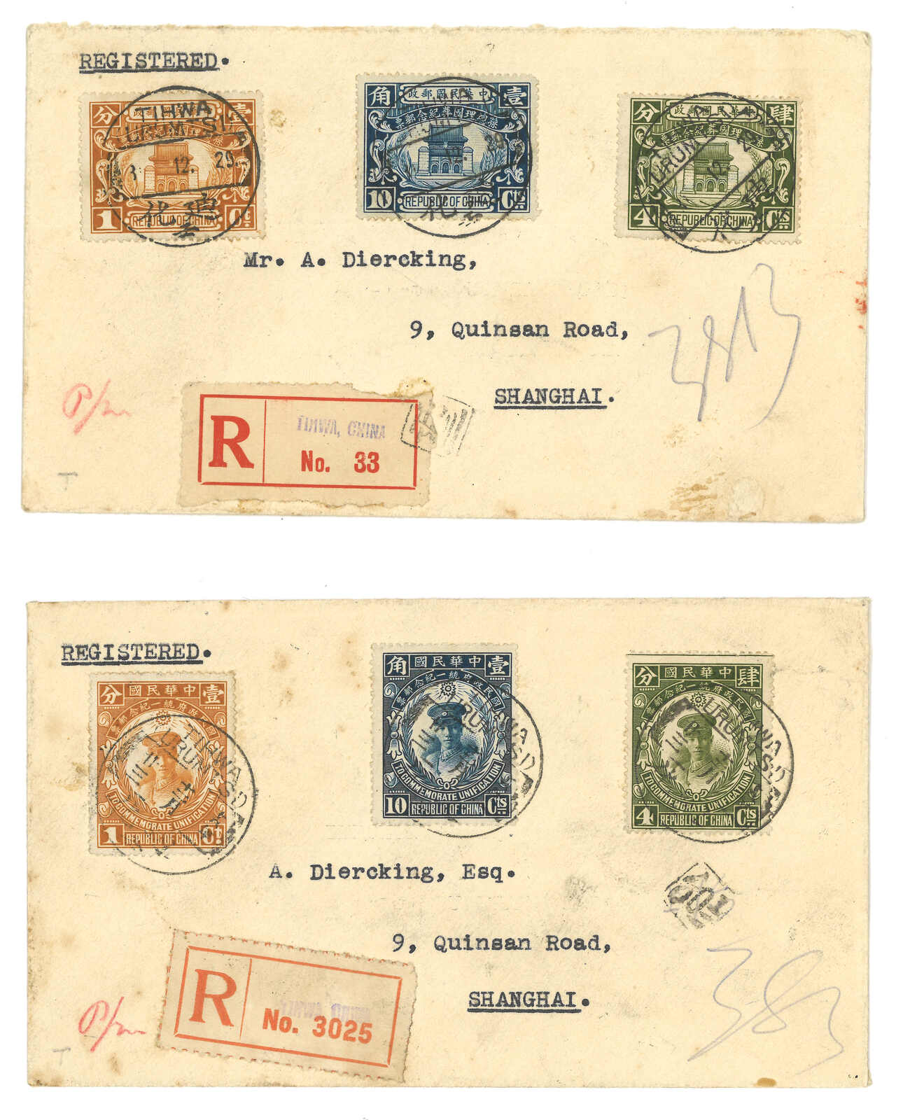 3181 cover image1929 a pair of registered covers from Tihwa to Shanghai, f.w. unovpt. Unification and State Burial issues respectively, tied by TIhwa bilingual cds. Both with registered and censor label. Ovpt. "For Use in Sinkiang" issues should be used but exceptions on commemorative issues are seen.