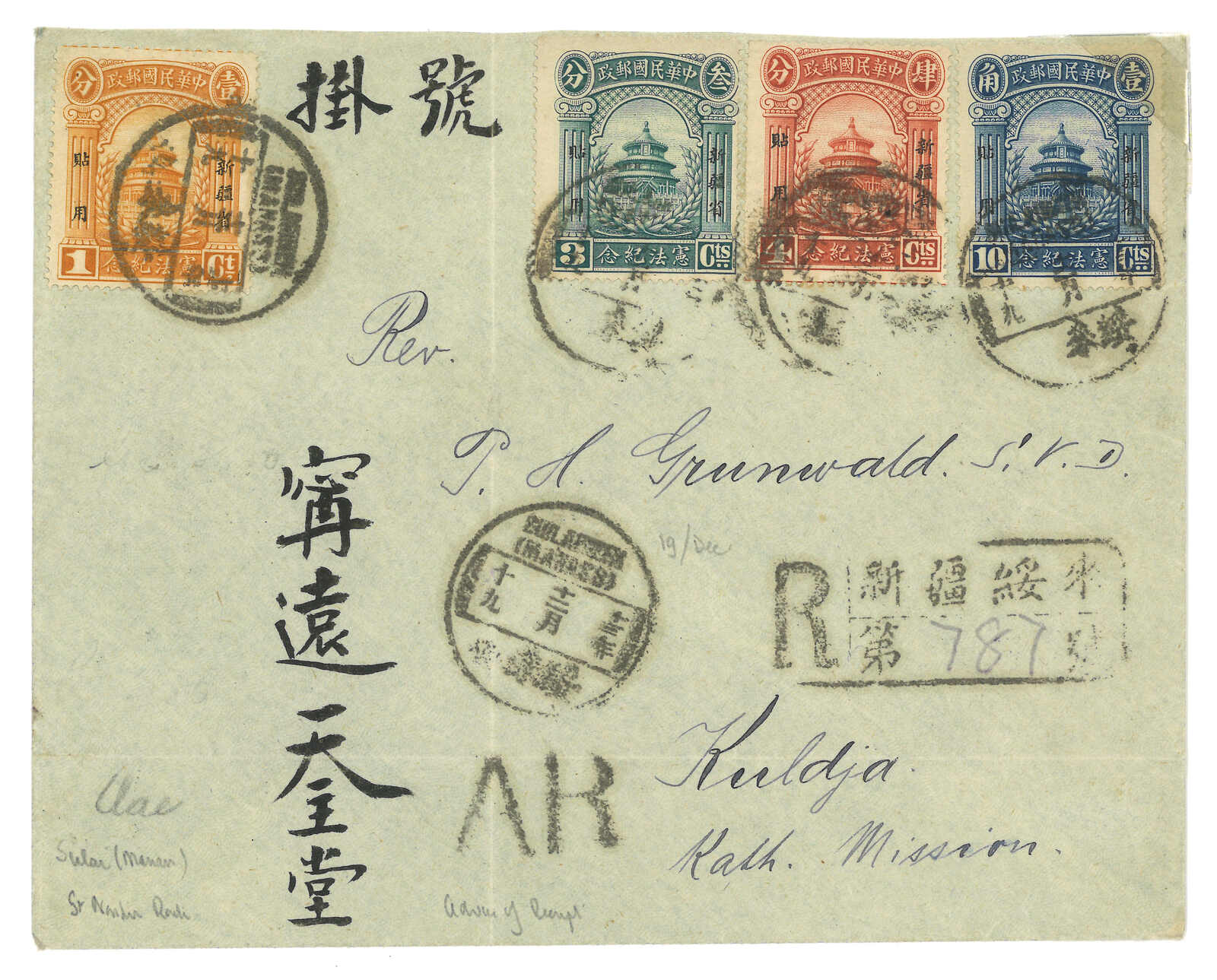 1920年代迪化寄上海的德鏗。掛號封,貼未加蓋統一紀念票1元(陳目300),銷迪化腰框英漢日戳。另見掛號標籤及檢查封條。抵上海。當時應貼用加蓋限新票,但在紀念票上時見例外,1元高面值票更是出色。(Image 1) (Image 2)